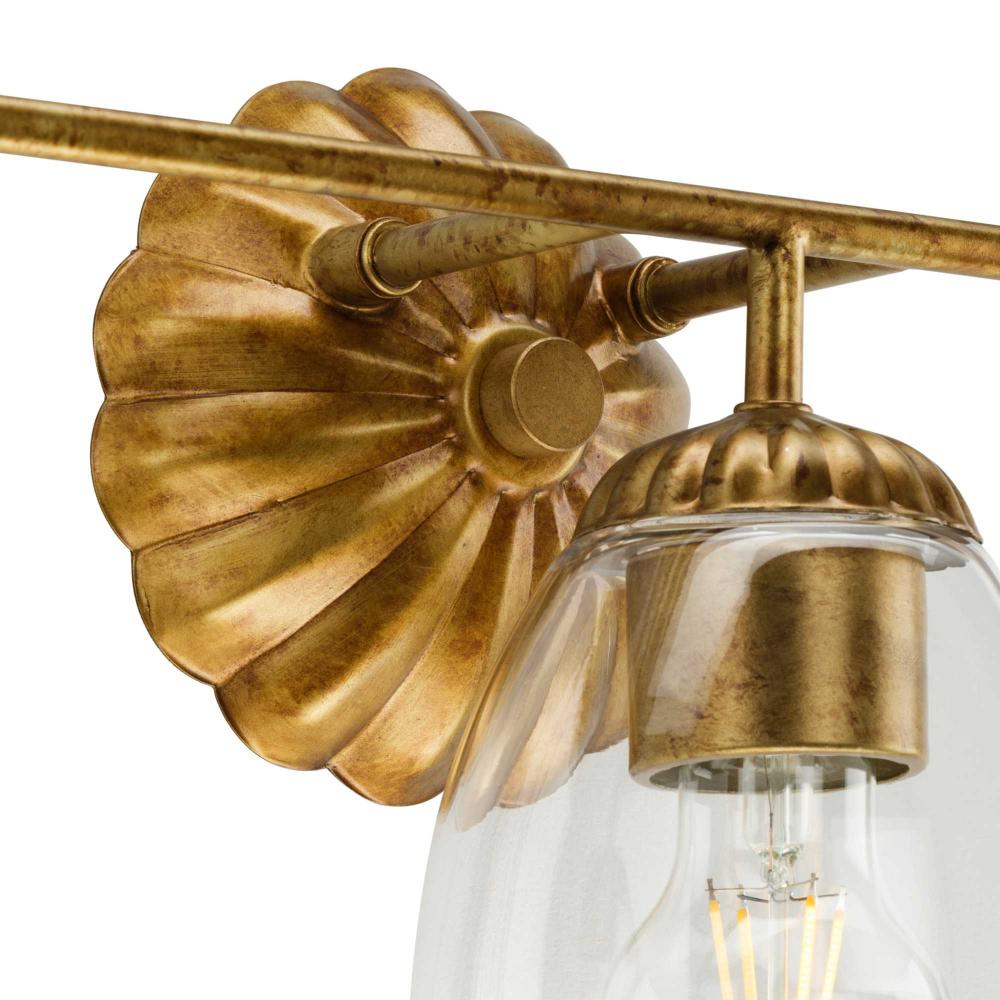 The Quillan Three-Light Vanity Light offers a graceful flourish to add distinctive designer touch. Scalloped elements create a richness of detail to complement the clarity of clear, elliptical glass shades. Each fixture includes both matching and contrasting accent rings. This versatile light can be mounted up or down to provide clear illumination to the room.