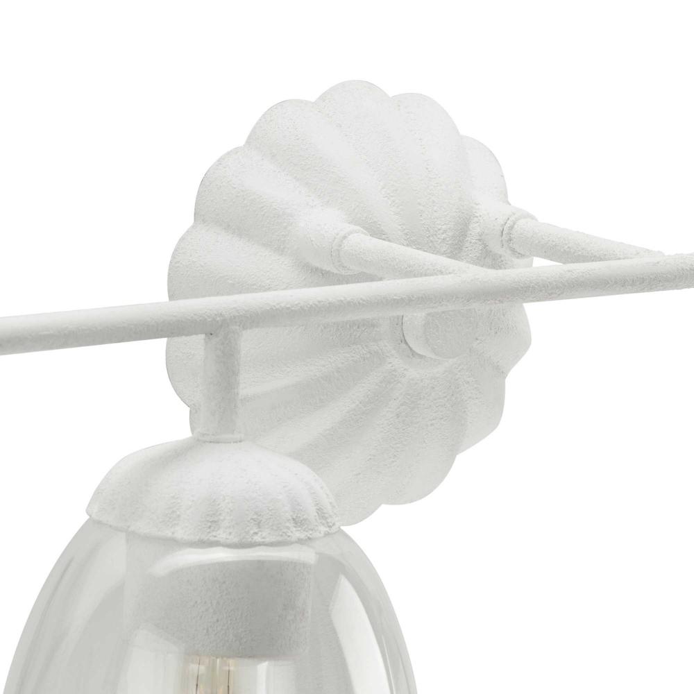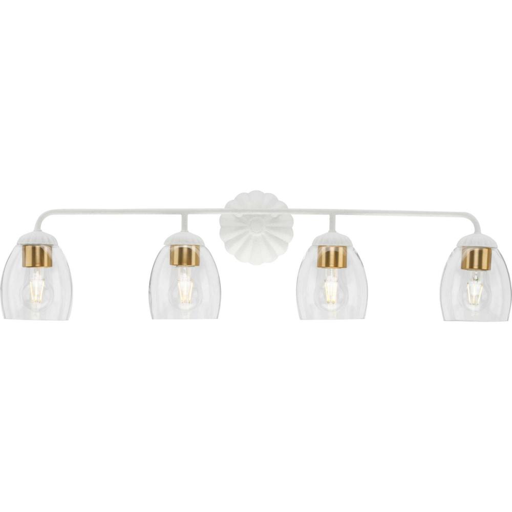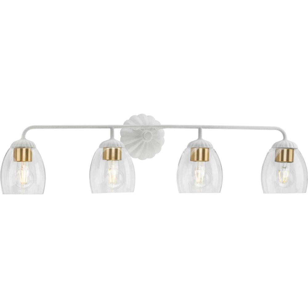 The Quillan Four-Light Vanity Light offers a graceful flourish to add distinctive designer touch. Scalloped elements create a richness of detail to complement the clarity of clear, elliptical glass shades. Each fixture includes both matching and contrasting accent rings. This versatile light can be mounted up or down to provide clear illumination to the room.