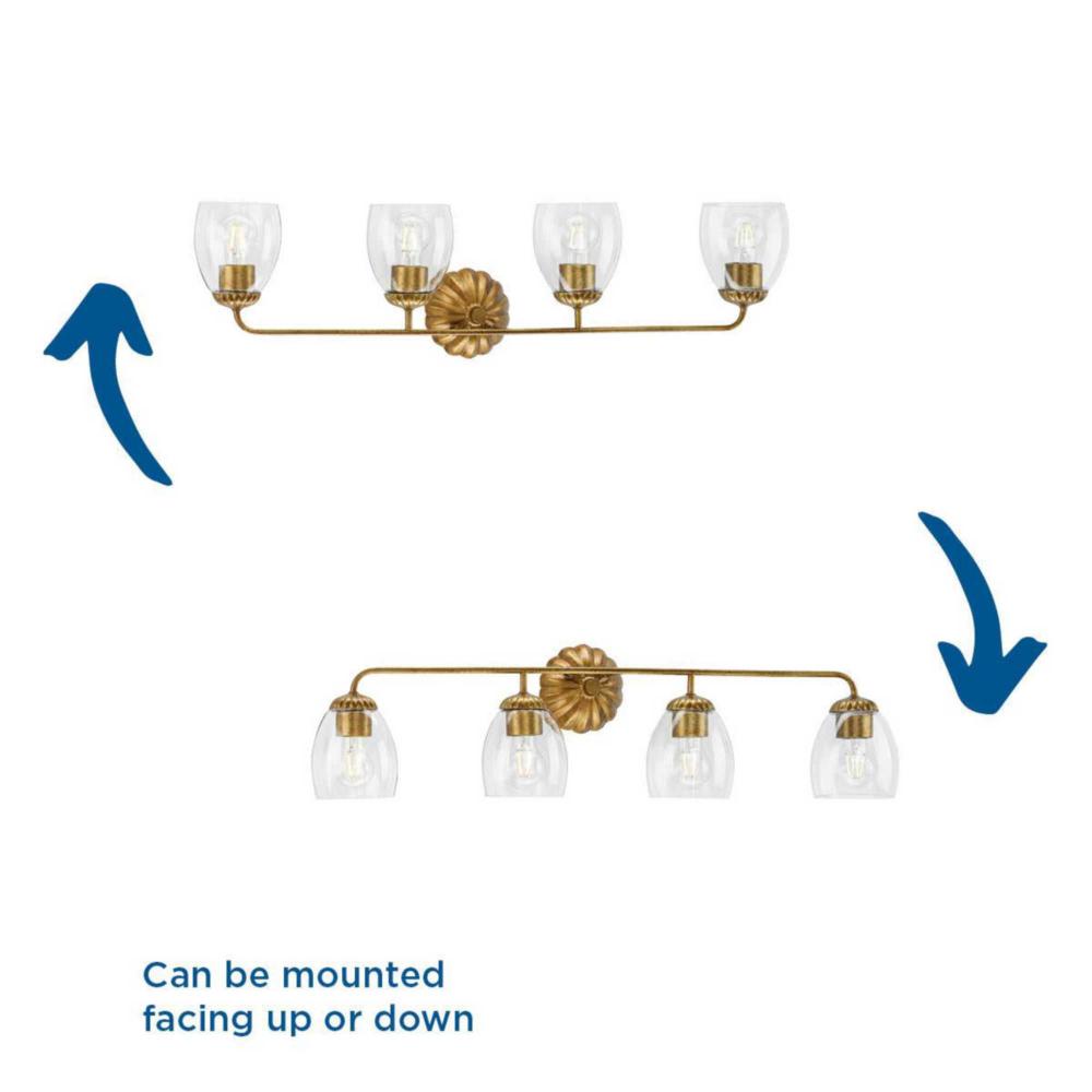 The Quillan Four-Light Vanity Light offers a graceful flourish to add distinctive designer touch. Scalloped elements create a richness of detail to complement the clarity of clear, elliptical glass shades. Each fixture includes both matching and contrasting accent rings. This versatile light can be mounted up or down to provide clear illumination to the room.