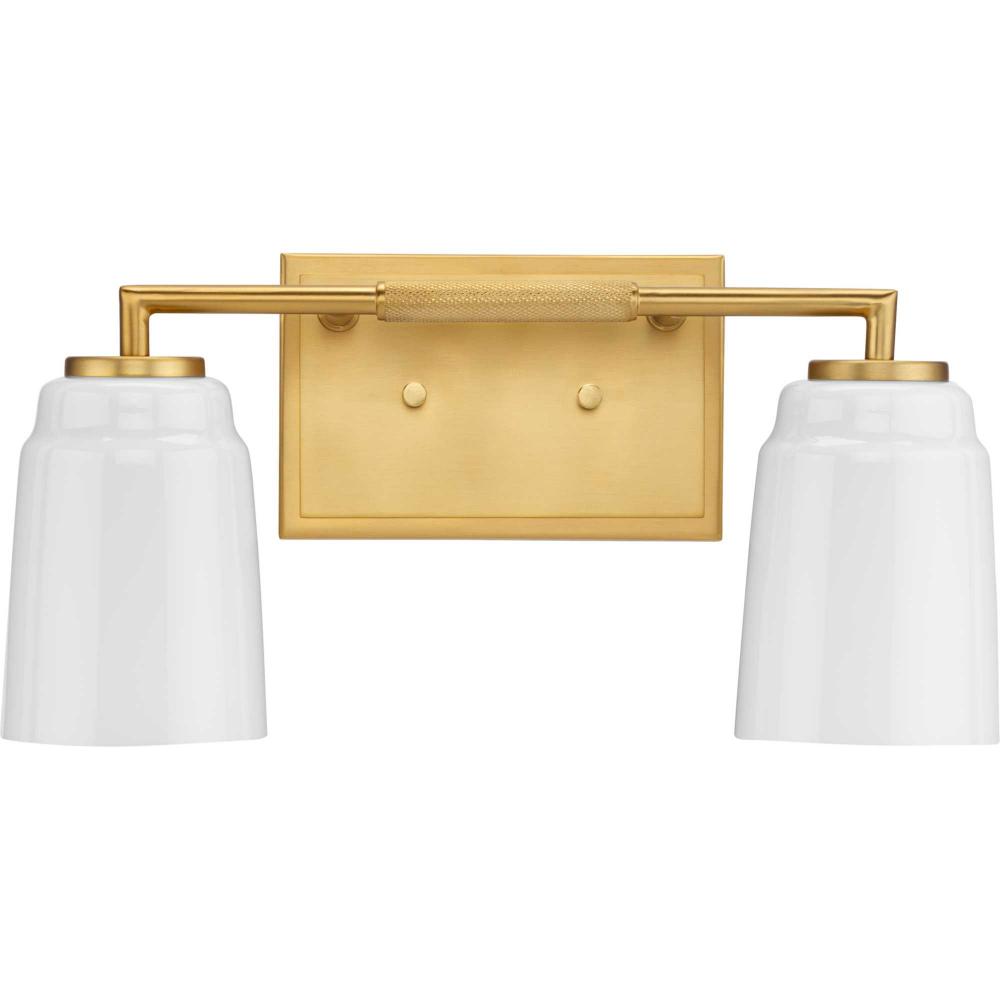 The Spenser vanity light has a streamlined design finished in luxe Brushed Gold contrasted by machined industrial-styled knurling. Rounded opal glass shades soften the fixture’s industrial look. The versatile fixture can be mounted with the shades facing up or down to suit your preference.