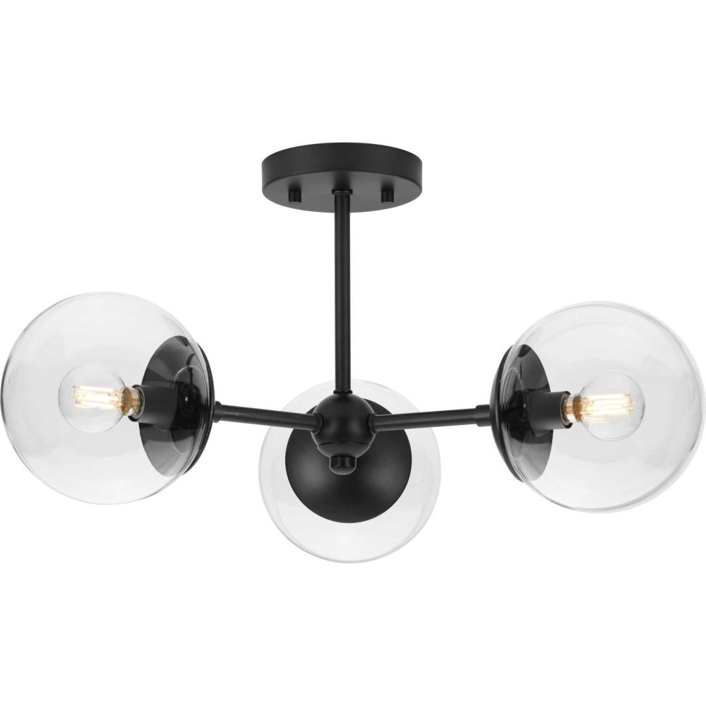 Long lines ending in clear glass globe shades define the Atwell Close-to-Ceiling fixture's modern aesthetic. One central stem is capped by clear glass, creating bright illumination from the light source glowing within. Atwell fits beautifully into mid-century modern and contemporary settings, delivering ambient illumination to bedrooms, halls and foyers and settings, delivering ambient illumination to bedrooms, foyers and living rooms.