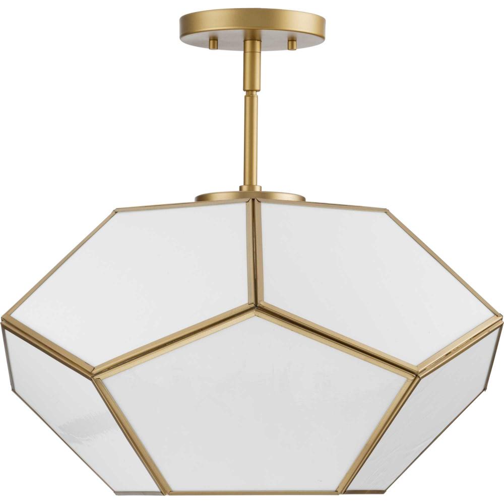 Charmingly distinctive, the Latham Collection glows from within. The large light is composed of a geometric framework finished in Vintage Gold that features an artful array of handmade white art glass. This versatile fixture can be mounted as a semi-flush mount or as a pendant. Inspired as a modern expression of an origami lantern, the light delivers striking illumination to spaces below.