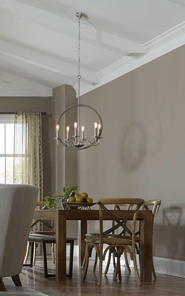 With updated designs that honor the charm of early American styling, Fontayne six-light chandelier provides a timeless elegance to Rustic Farmhouse, Modern Farmhouse and Urban Industrial spaces. Impressive graphic elements take center stage, while candelabra lights highlight subtle curves. Dual tone finish combinations of Brushed Nickel with weathered gray accents.