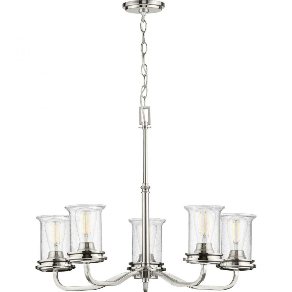 Immerse yourself in a home atmosphere primed for relaxation and inspired thinking with the beautiful craftsmanship of this five-light chandelier. Savor this fresh take on a classic light choice as your gaze traces graceful arms and clean crisp lines coated in a beautiful brushed nickel finish. Lightly seeded glass shades rest in shiny pedestal light bases that adds an unexpected, but welcomed dash of modern personality to this clean, traditional design.