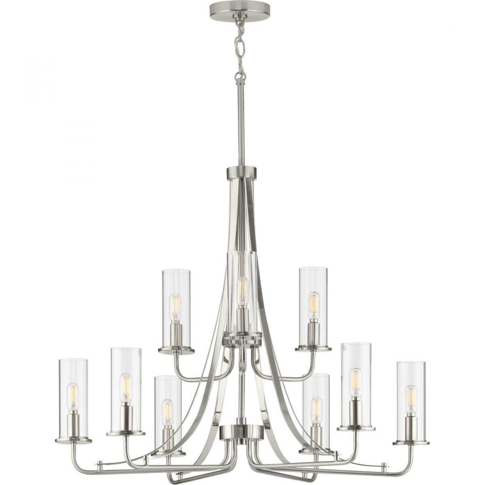 Incorporate A Sleek Simplicity And Natural Beauty With The Riley Collection'S Nine-Light Brushed Nickel Chandelier. Clear Glass Shades Are Ready To Offer Stunning Rejuvenating Illumination. The Shades Rest On A Gorgeous Dual-Tone Frame With A Brushed Nickel Finish Accented By A Polished Chrome Trim That Manifests Feelings Of Tranquility And Serenity.