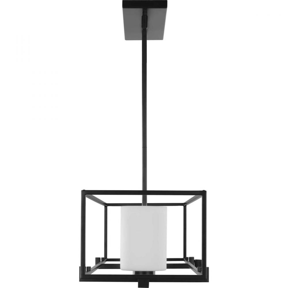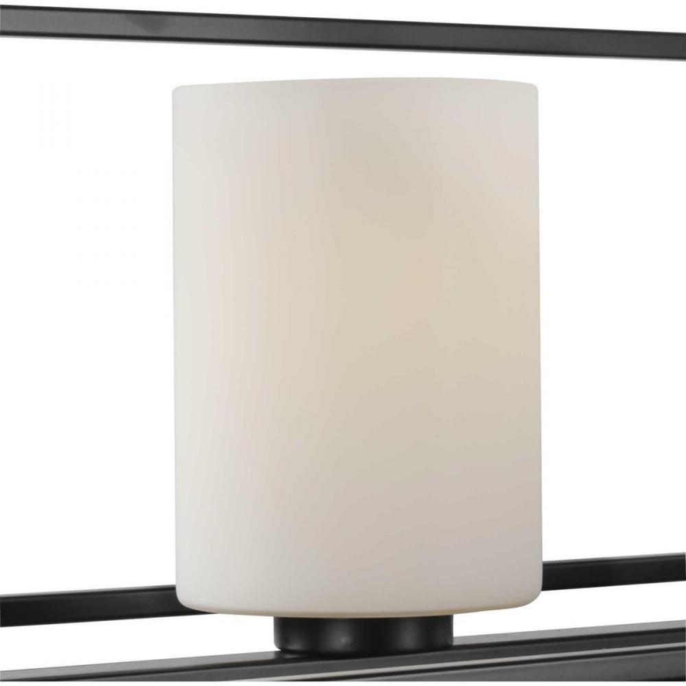 Stick with simple geometric forms and clean crisp lines with the modern Chadwick Collection's Three-Light Matte Black Island Chandelier. A beautiful etched opal glass shade visually calms the sharp edges of the boxy frame in a masterful stroke of design excellence. The frame is coated in a matte black finish that visually contrasts with the light shade. The light fixture is just right for spaces in need of a subtle, feminine touch.