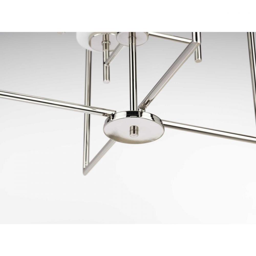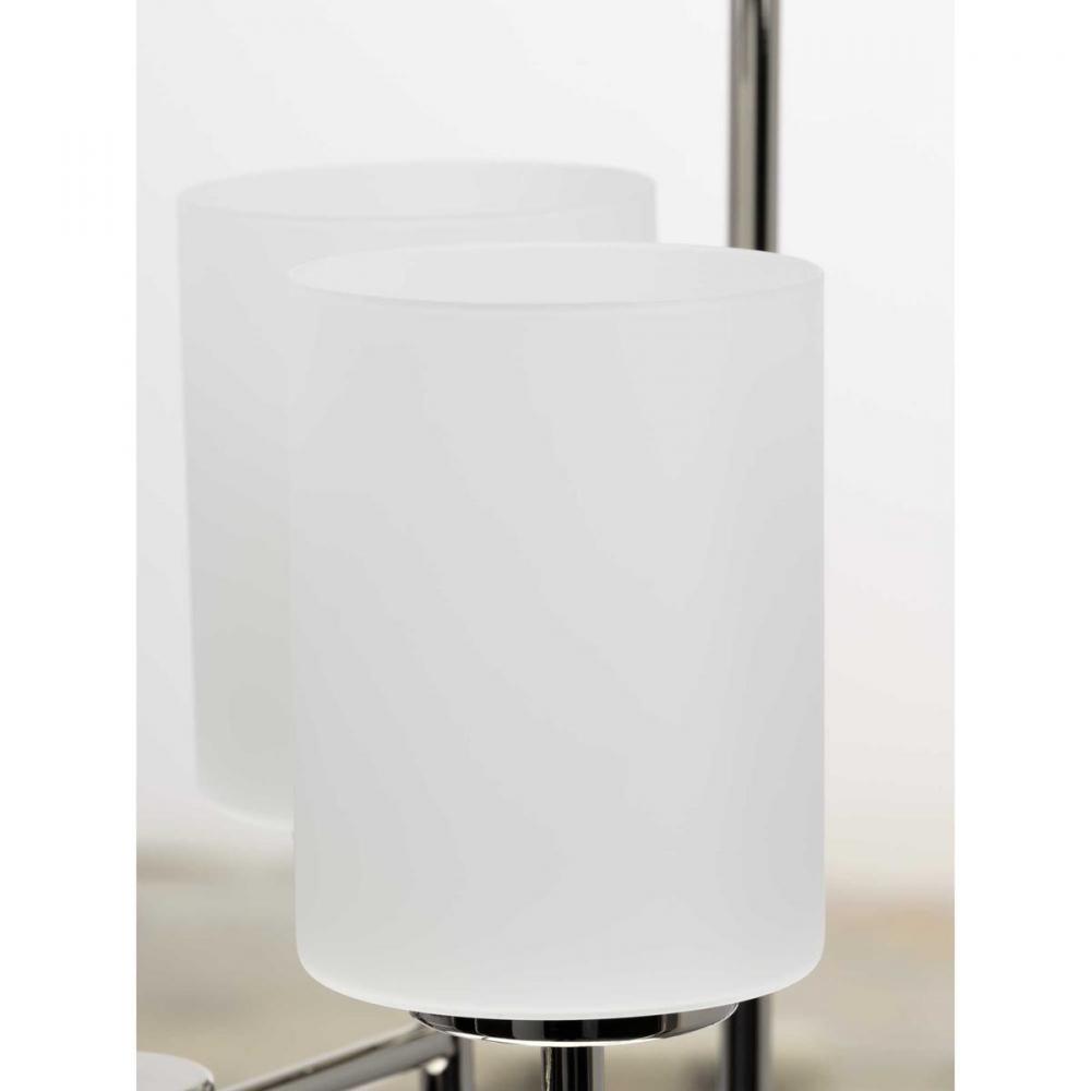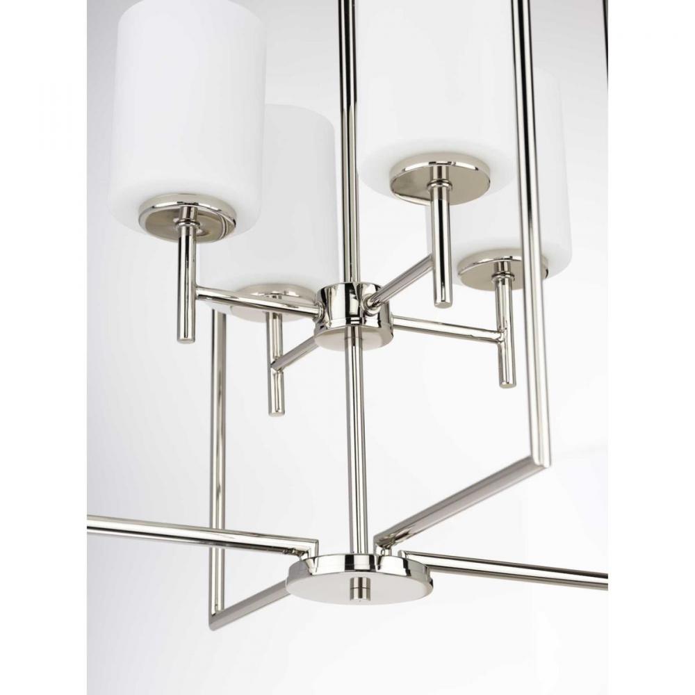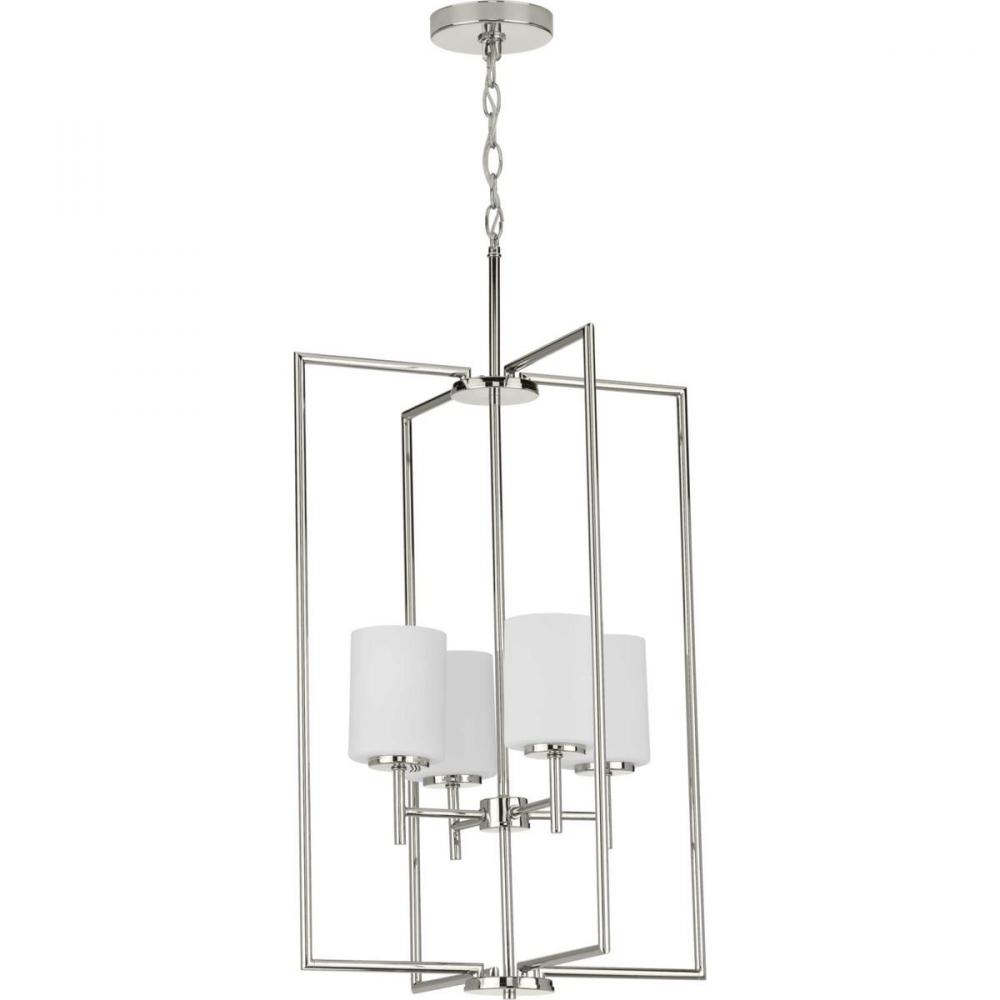 The simple, flattering design of the Replay four-light pendant boasts a subtly reflective Polished Nickel finish and classic, etched glass diffusers. The elongated silhouette with clean, smooth lines makes it a striking fixture for a foyer or over a dining table or kitchen island in transitional and modern interiors.