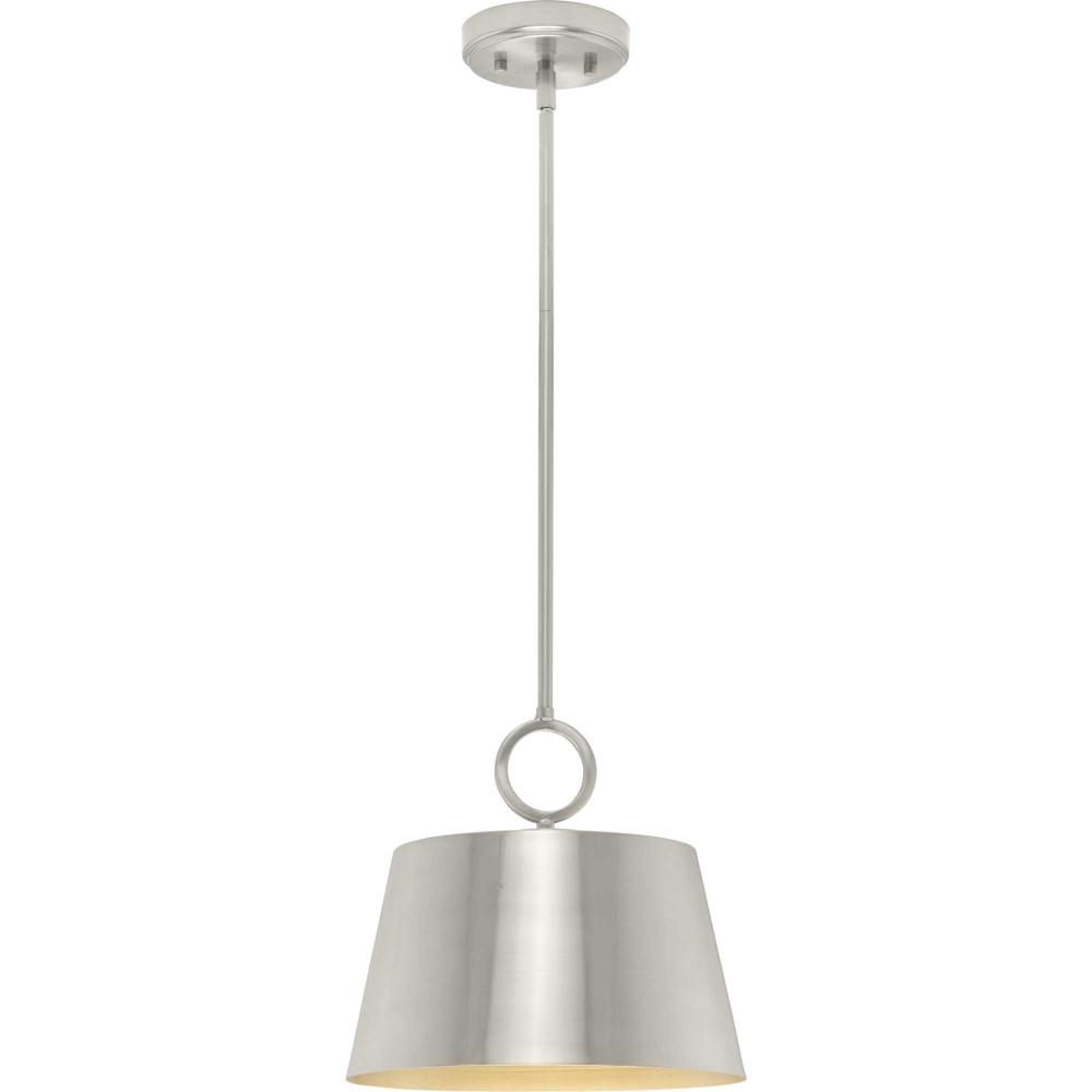 The Parkhurst pendant features a crisp dome metal shade suspended by an elegant ring. Light gleams softly from within the gold-finished interior, casting a soft glow on the surfaces below. This substantial pendant has warmth and depth and is ideal for new traditional, modern farmhouse, and transitional interiors.