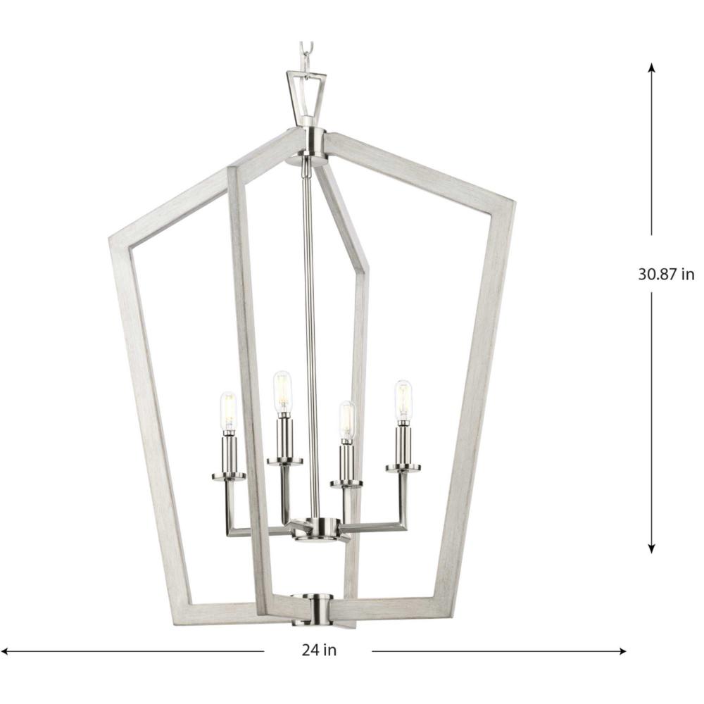 Clean, modern lines combine with rustic elements in the Galloway Collection. A lightly distressed grey washed oak finish highlights an open, angular frame suspended from an adjustable chain and simple round canopy, all finished in subtle brushed nickel. Brushed nickel columns hold candelabra lights that glow brightly within the stately form to illuminate spaces in a casually elegant style. The larger scale and airy design of this foyer light makes it the perfect accompaniment for great rooms, bedrooms and dining rooms.