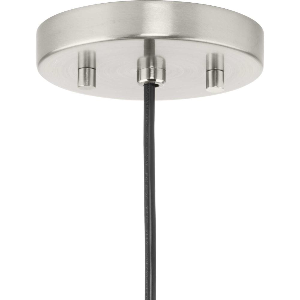The light is coated in a subtle brushed nickel finish accented by an interior finish of white