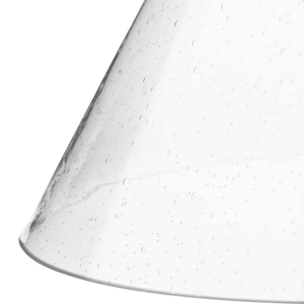 The pendant's metal fittings and cone shaped seeded glass shade creates a stately accent to modern themes