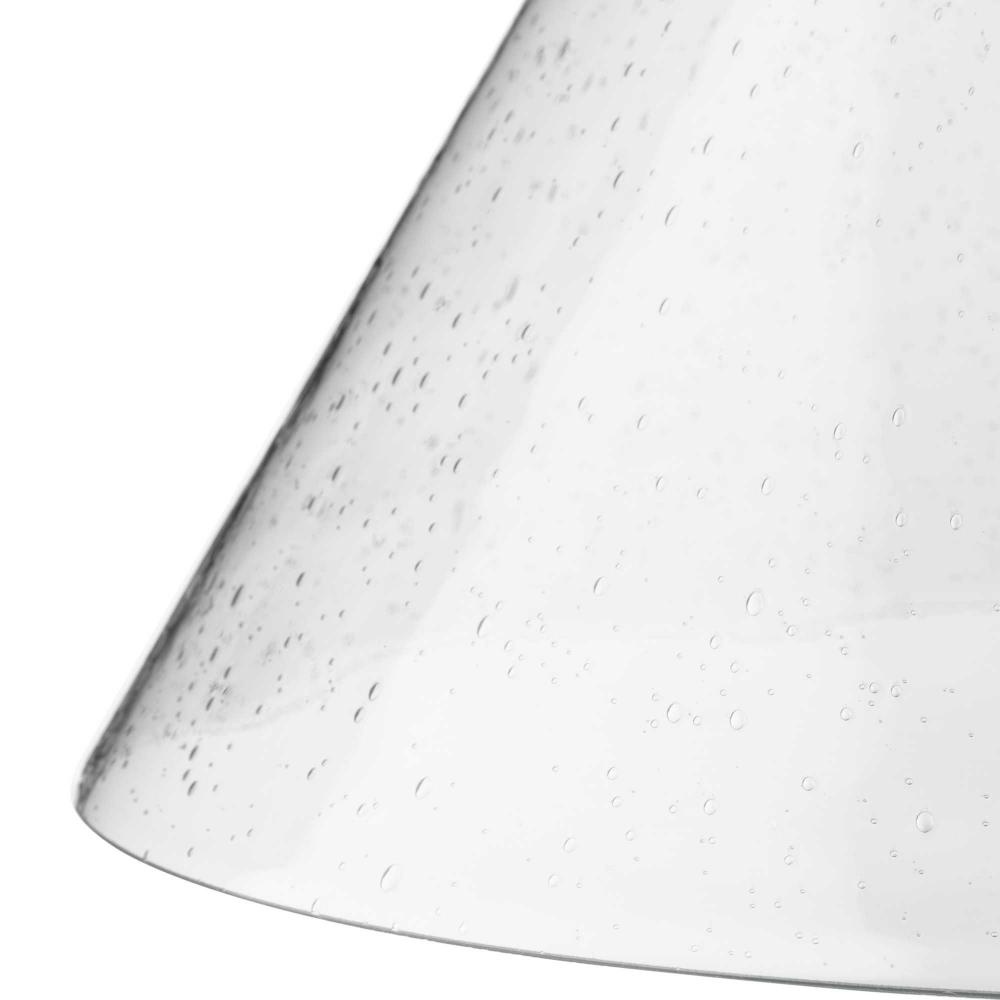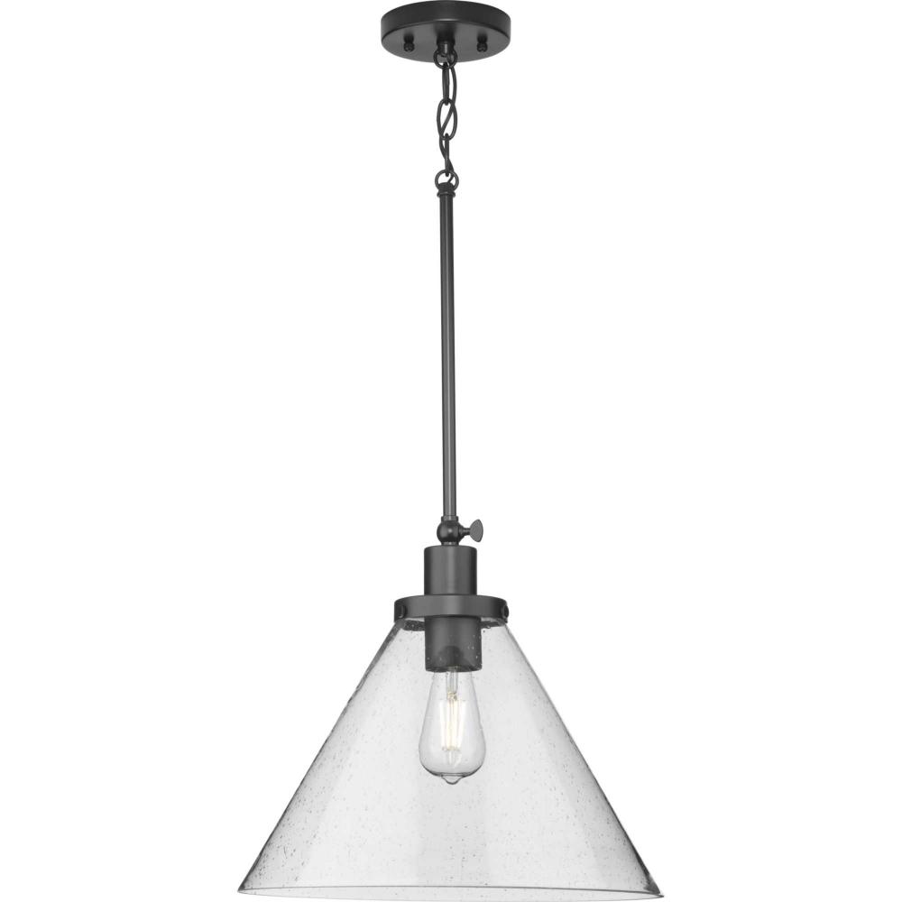 The pendant's metal fittings and cone shaped seeded glass shade creates a stately accent to modern themes