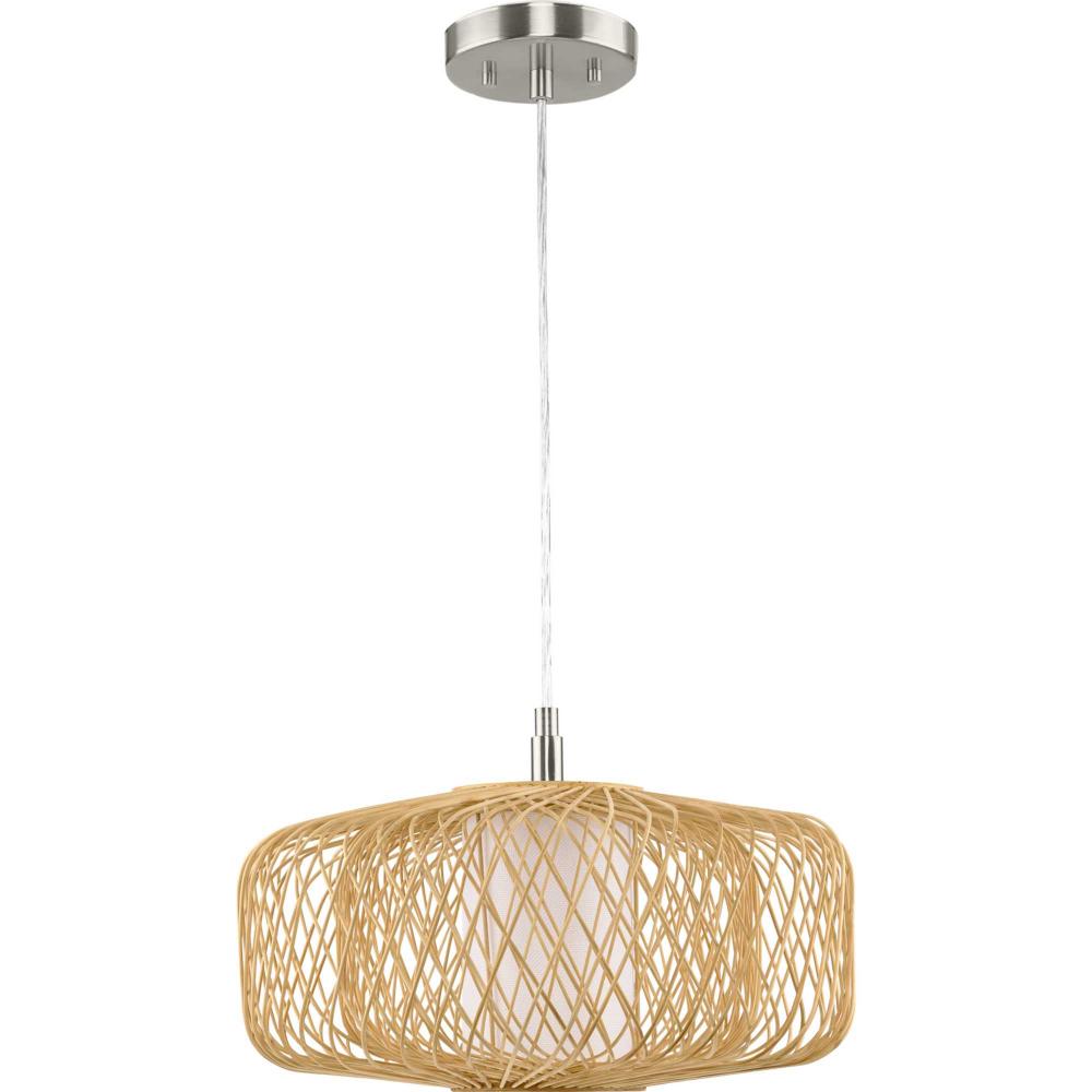 The pendant features a white linen fabric diffuser surrounded by a natural rattan shade
