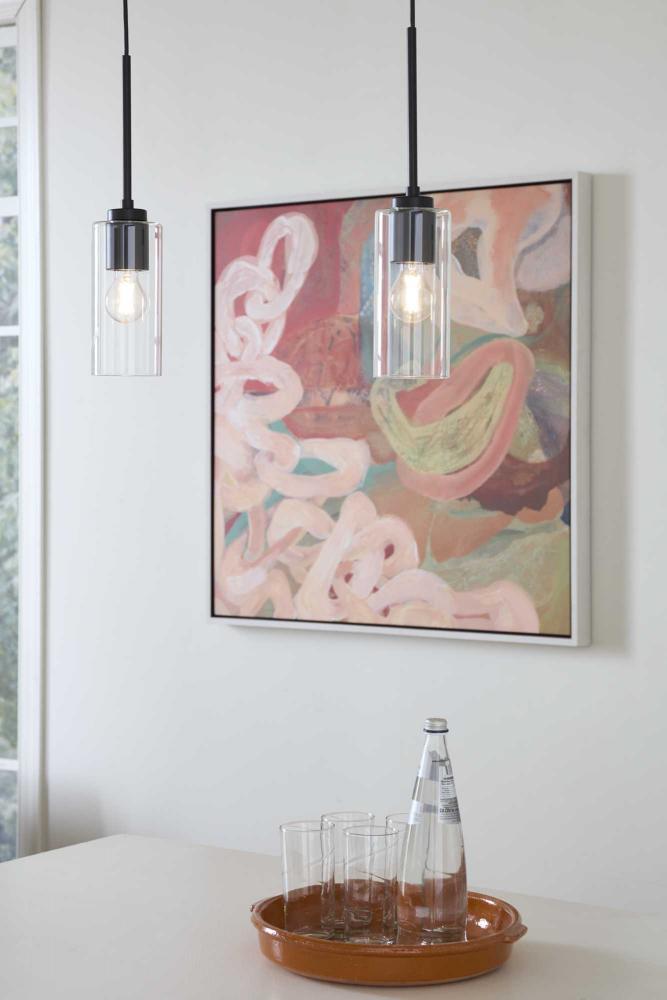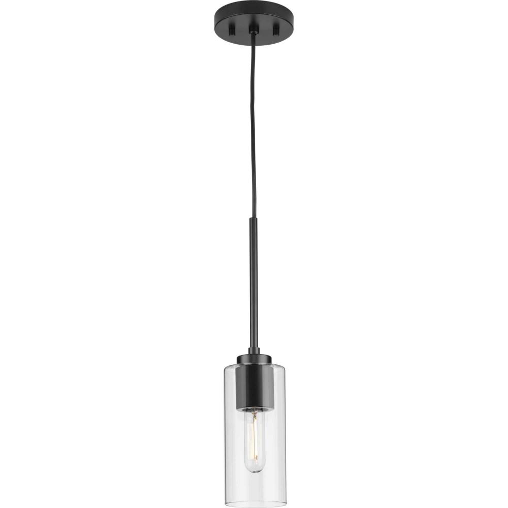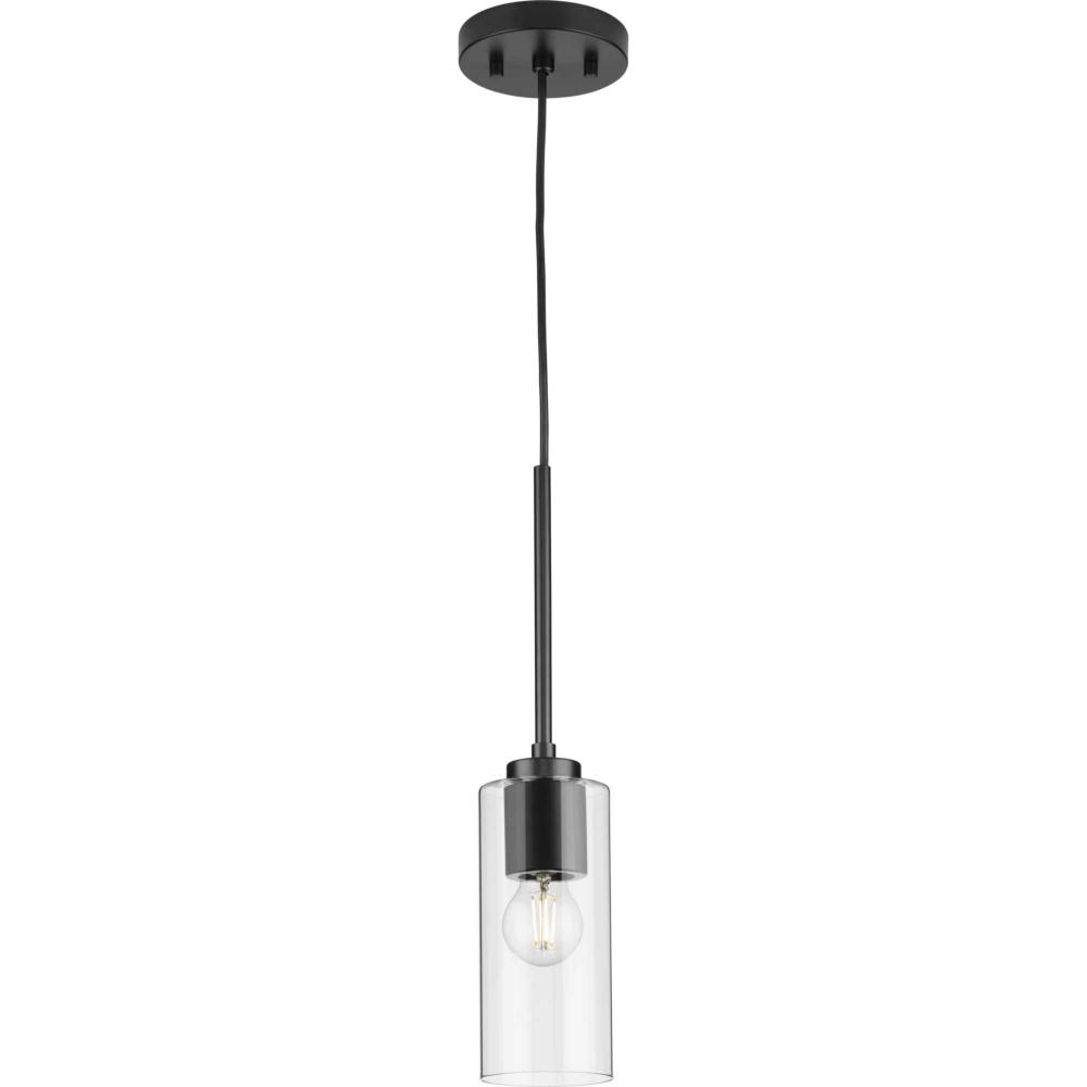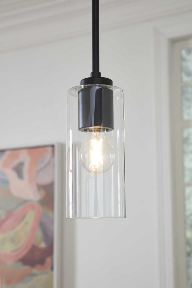 The light's slender design complements mid-century modern, transitional and contemporary settings with a simple round canopy suspended over a cylindrical glass shade