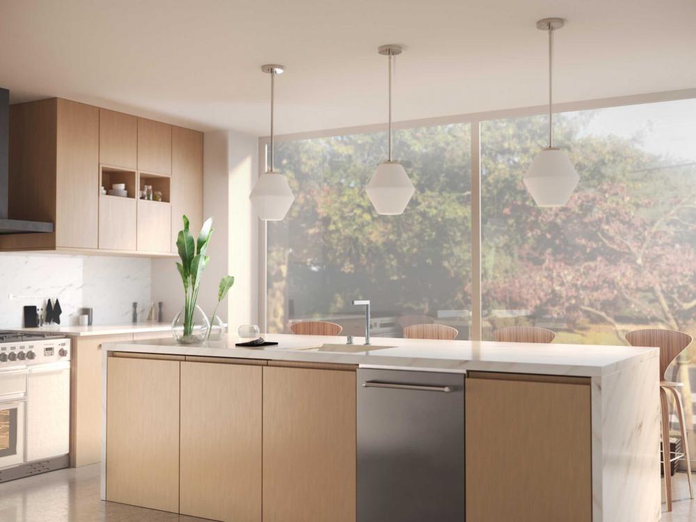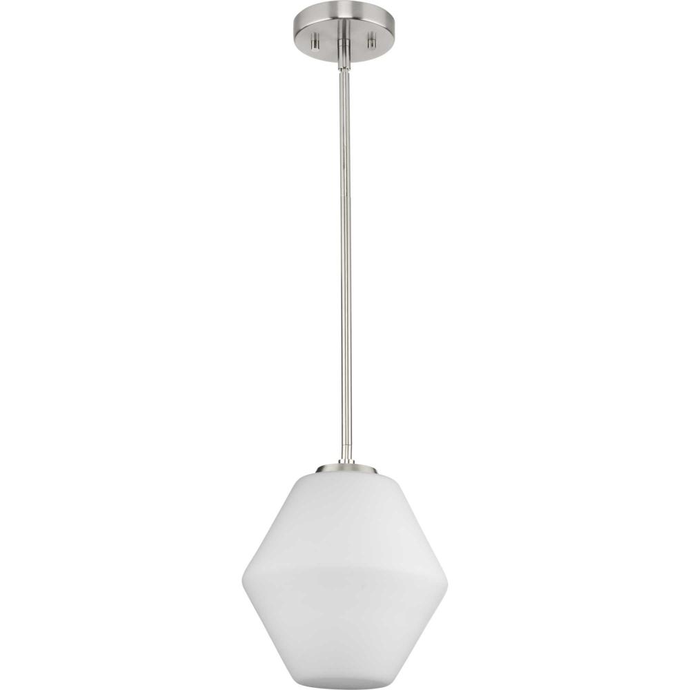 The light's updated design complements mid-century modern, transitional, and contemporary settings with a stem hung pendant with a soft geometrical diamond silhouette glass shade