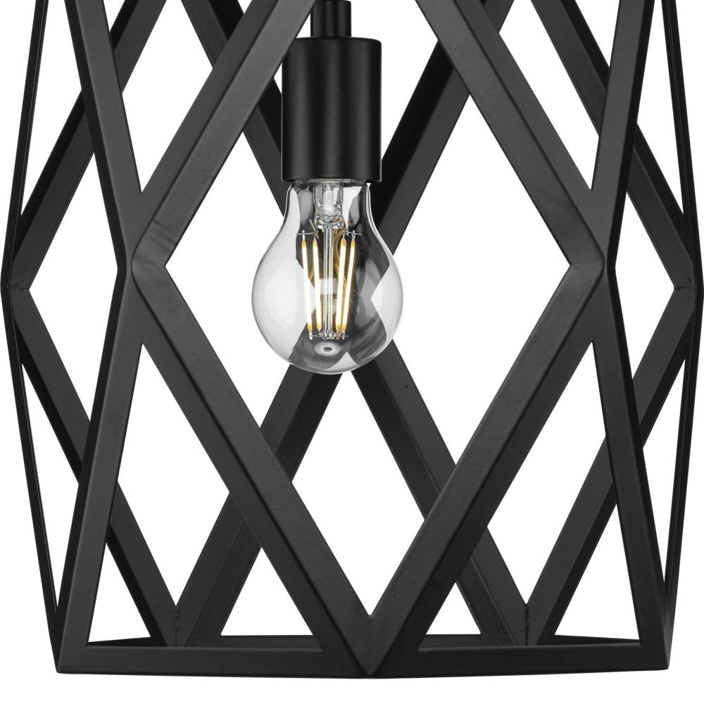 The pendant features painted black steel blending together in an esoteric conjunction, creating a prominent geometrical surround