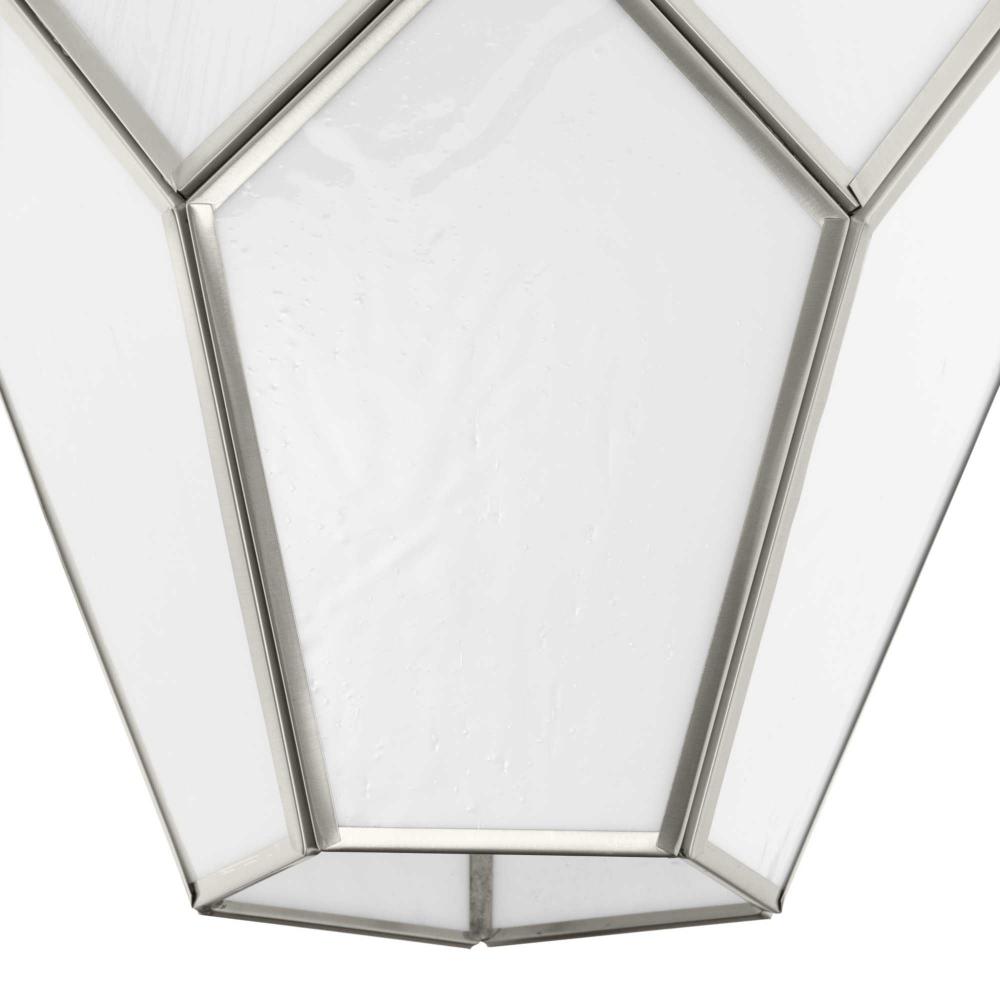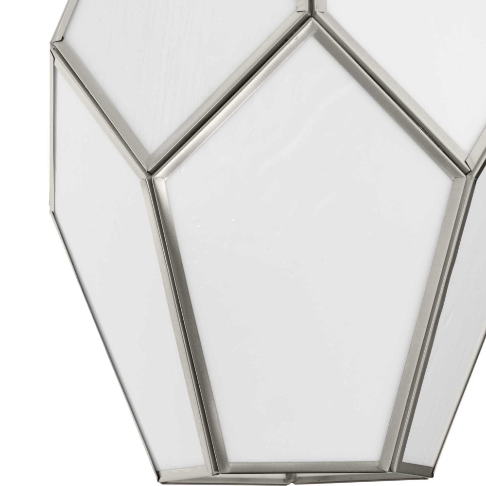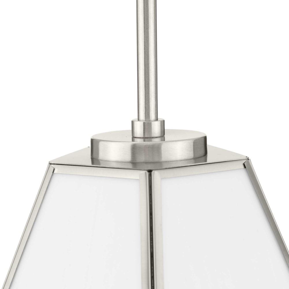 Charmingly distinctive, the Latham Collection glows from within. The Pendant Light is composed of a geometric framework finished in Brushed Nickel that features an artful array of handmade white art glass. Inspired as a modern expression of an origami lantern, the light delivers striking illumination to spaces below.