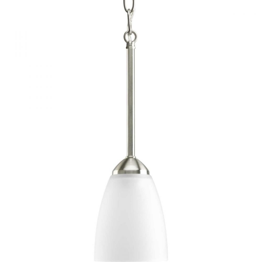 Brushed Nickel finish.;White etched glass shades provide distinctive lighting.;Includes two 6" stems and 42 in of chain.