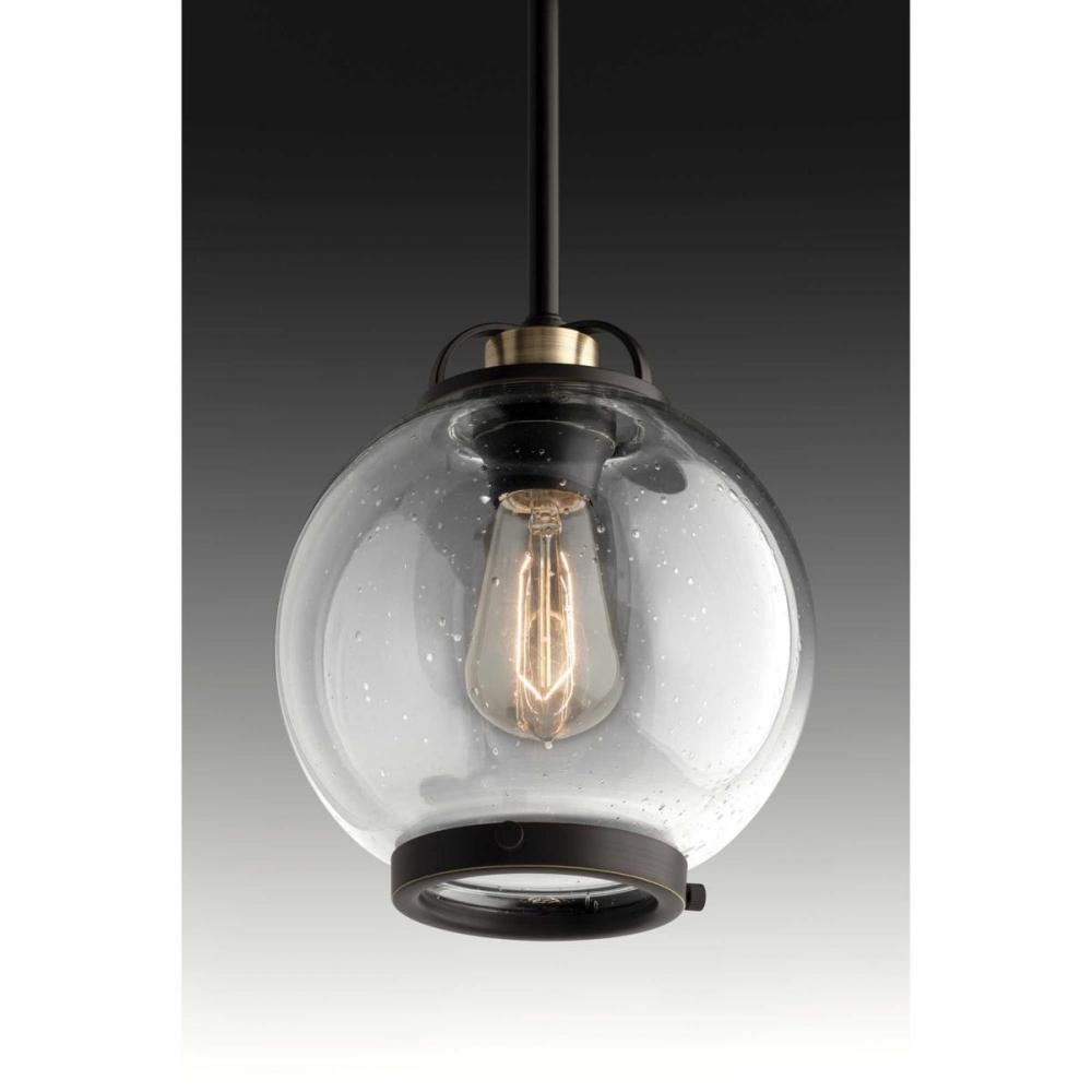 Ideal for commercial-style home kitchens or vintage dining areas.;Metal trim accent ring adds a finishing touch the spherical glass globe.;Clear seeded glass with an Antique Bronze frame.;Includes one 6", four 12" stems and 6 links of chain.