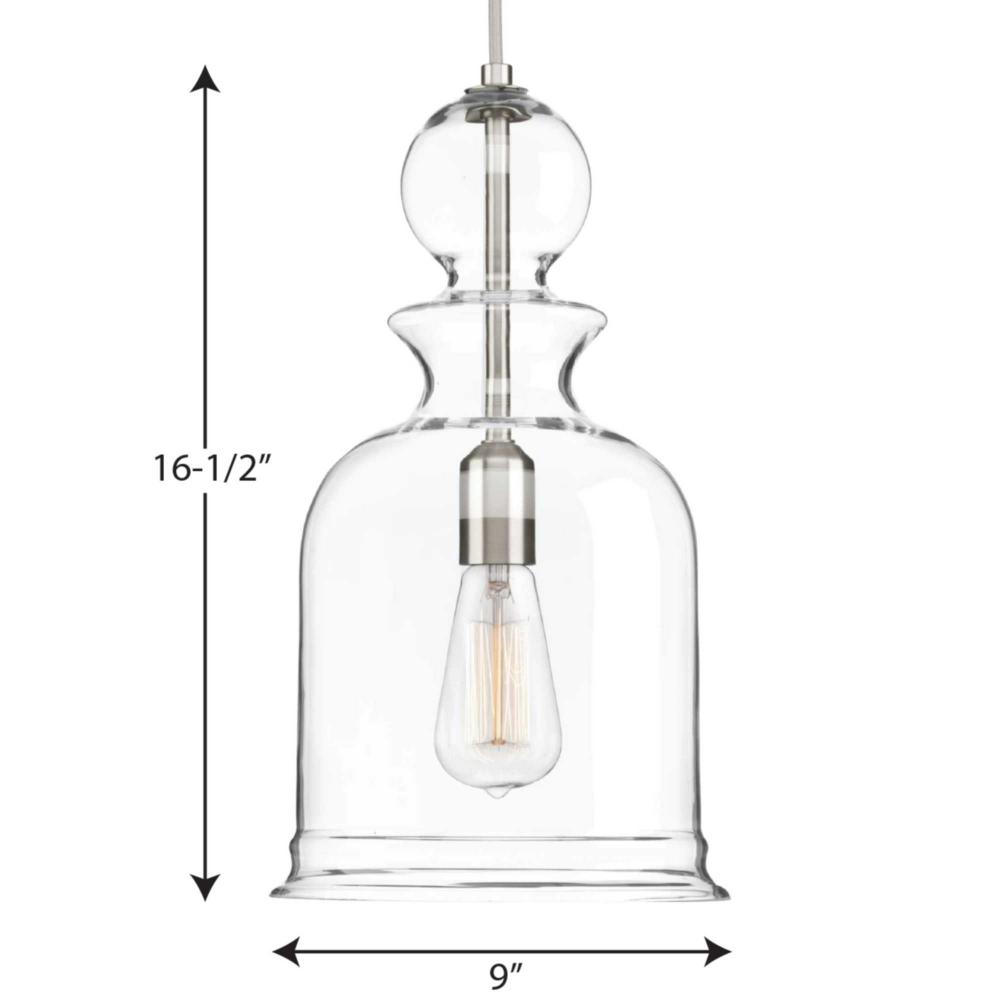 Inspired by the stacked modern elements of items found in Parisian boutiques, Staunton's chess piece bell silhouette offers a signature focal point. A hint of Brushed Nickel peeks through the clear glass. The multiple shapes and glass options offers the ability to mix and match for customized look.