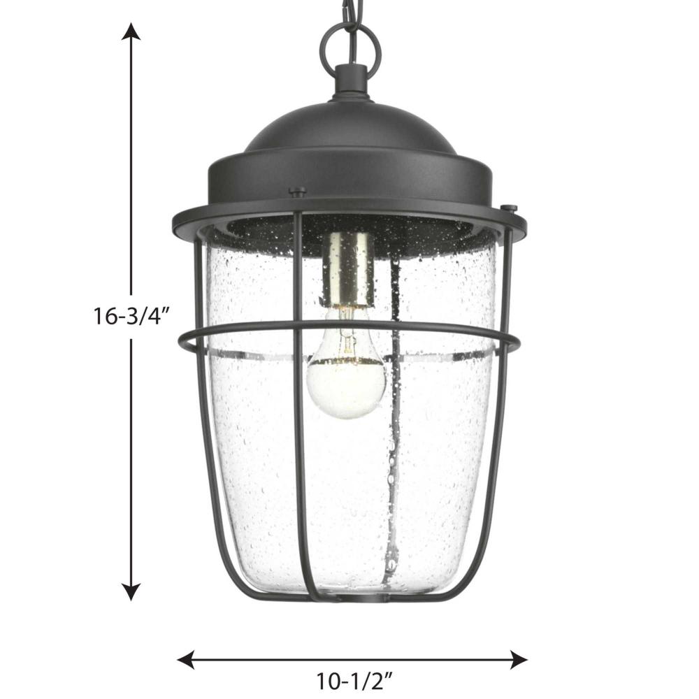 A nautical-inspired collection ideal for a variety of exteriors, including Coastal, Transitional and Urban Industrial settings. The one-light black hanging lantern with clear seeded glass feature a hint of brushed nickel on the interior. Geometric details offer a finishing touch for wall, hanging and post lantern options.