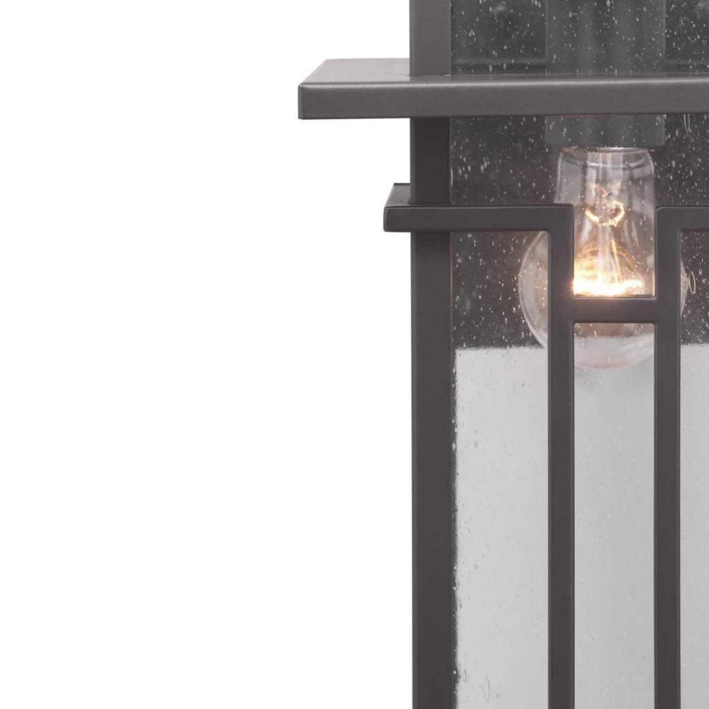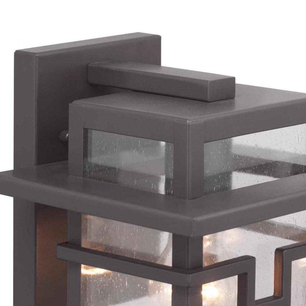 Linear detailing around a clear seeded-glass shade channel Frank Lloyd Wright’s iconic designs;The medium wall lantern makes a distinctive greeting on either side of an entry door, flanking an outdoor fireplace or hanging on the walls of a covered outdoo