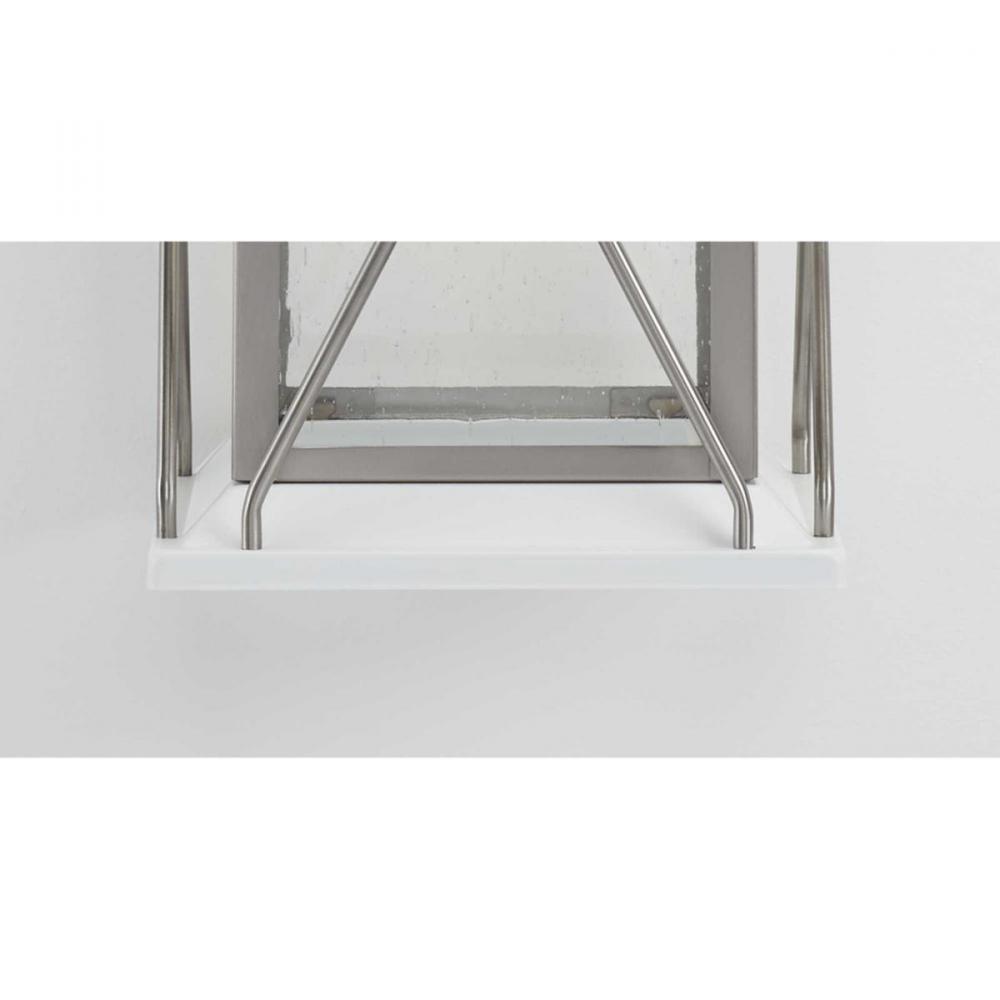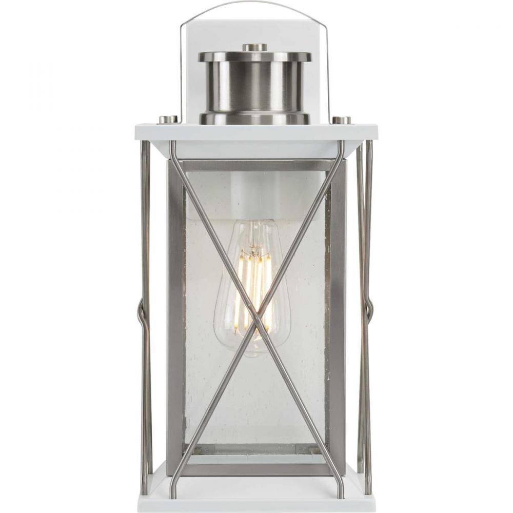 Transform You Home Into A Warm And Cozy Dream With The Friendly Farmhouse-Style Of This Small Wall Lantern. A Rustic X-Brace Design Decorates Each Side Of The Charming Lantern Silhouette. Clear Seeded Glass Panes Add An Extra Pop Of Rustic Personality. A Stainless Steel Finish Complemented With White Accents Adds Warmth And Character As The Lantern Infuses Your Home With Gentle Illumination.
