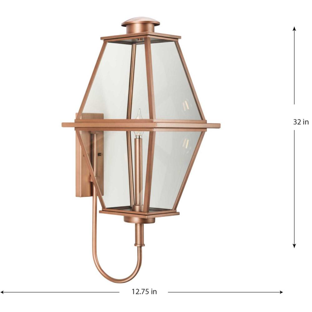 The Bradshaw Collection nods to historical style with its traditional lantern design, beautifully updating a homes curb appeal. A comforting glow is diffused through clear glass panes, creating a warm and romantic ambiance.The gracious lines of this large wall lantern, finished in mellow painted antique copper, elegantly complement exteriors of traditional, transitional and farmhouse settings. It is cULus wet location listed for use where water may be present, with a one-year warranty to guarantee your complete satisfaction. Progress Lighting products are designed for exceptional quality, reliability, and functionality.