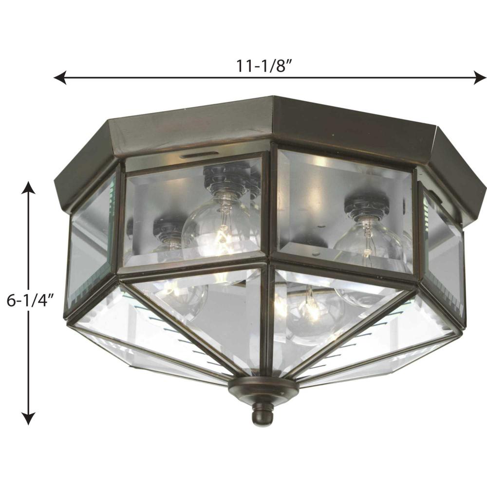 Four-light octagonal close-to-ceiling fixture with clear, bound beveled glass. Solid brass construction. G-lamps recommended. Traditional styling perfect for halls, closets, porches, laundry rooms, bedroom. Antique Bronze finish.