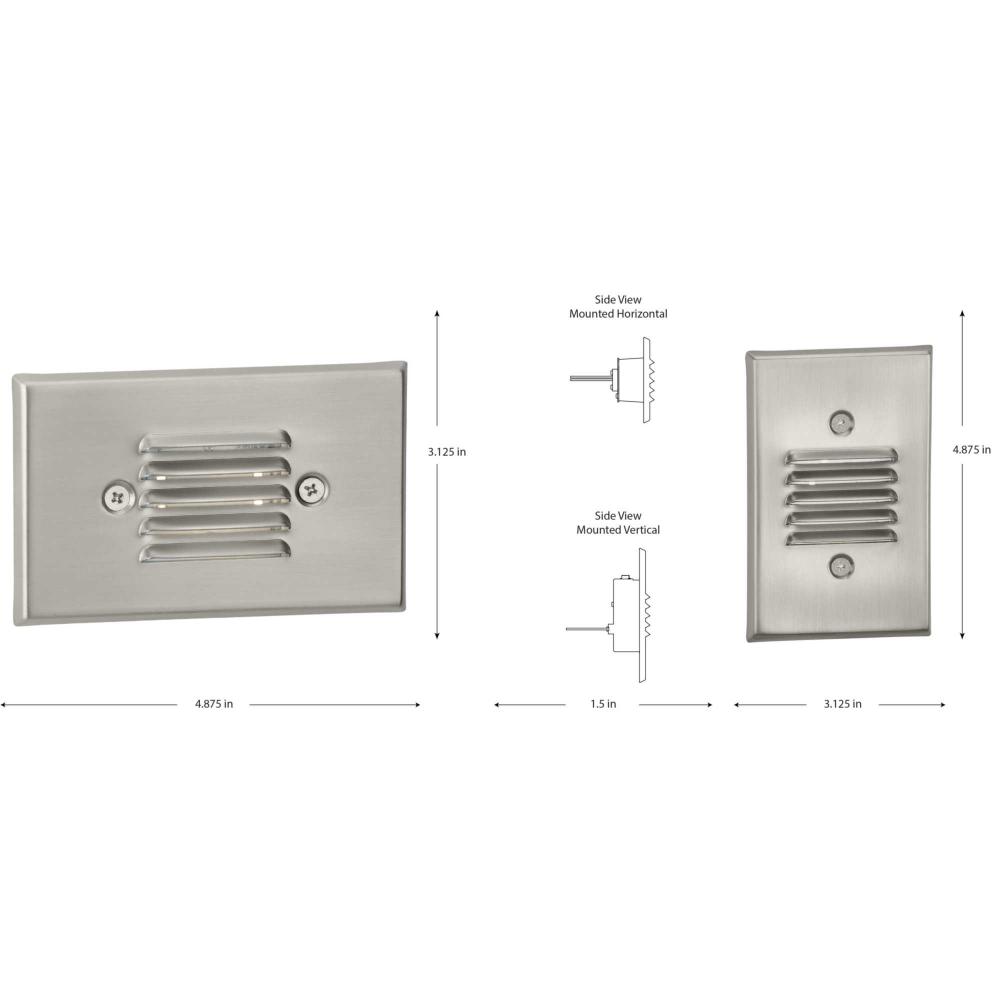 The LED Step/Wall Light finished in brushed nickel will seamlessly blend into many interior and exterior architectural styles, whether residential or commercial. A horizontal and a vertical exterior face plate are provided to accommodate either a horizontally or vertically oriented installation. The step light features an integrated 120V AC light engine, eliminating the need for an additional LED driver. The light engine is enclosed in a gasketed lens, allowing it to meet the rigorous demands of wet location use. Its dimmable LED light source offers optimized, energy-efficient light output, 3000K, 90CRI. The louvered face plates direct the light downwards to minimize glare and clearly illuminate stairs, walls, and walkways and resulting in performance, cost and safety benefits. It is cCSAus wet location rated for use in areas with direct water contact.