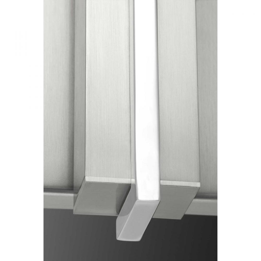 Rectangular design pairs with a geometric back plate to create Planck;1-light 16-watt LED wall bracket;Brushed Nickel finish with linear chrome accents;LED source provides indirect lighting as it reflects against a wall, offering both visual interest and f