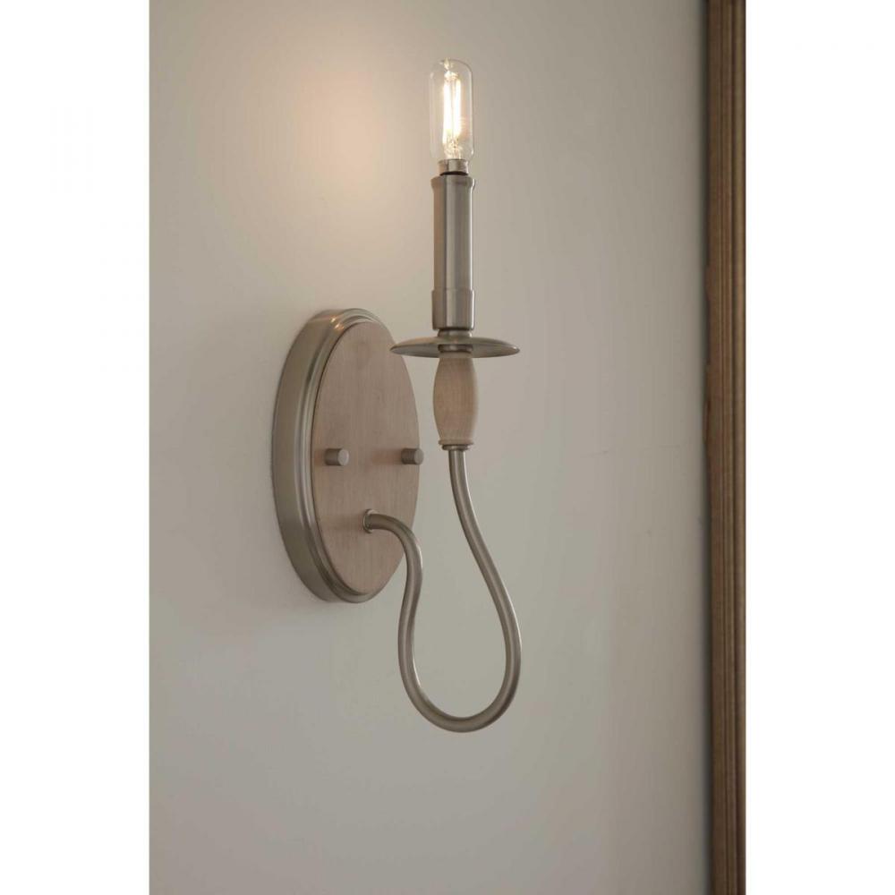 This versatile wall bracket from the Durrell Collection will easily find a home in a variety of settings in need of generous illumination. A light base reminiscent of a vintage candlestick is coated in a beautiful brushed nickel finish. Beneath the light base, a decorative wooden piece coated in a cerused white finish tops a long, curving metal arm. The arm attaches to a round brushed nickel backplate with a faux-painted wooden center for a mixed-elements aesthetic.