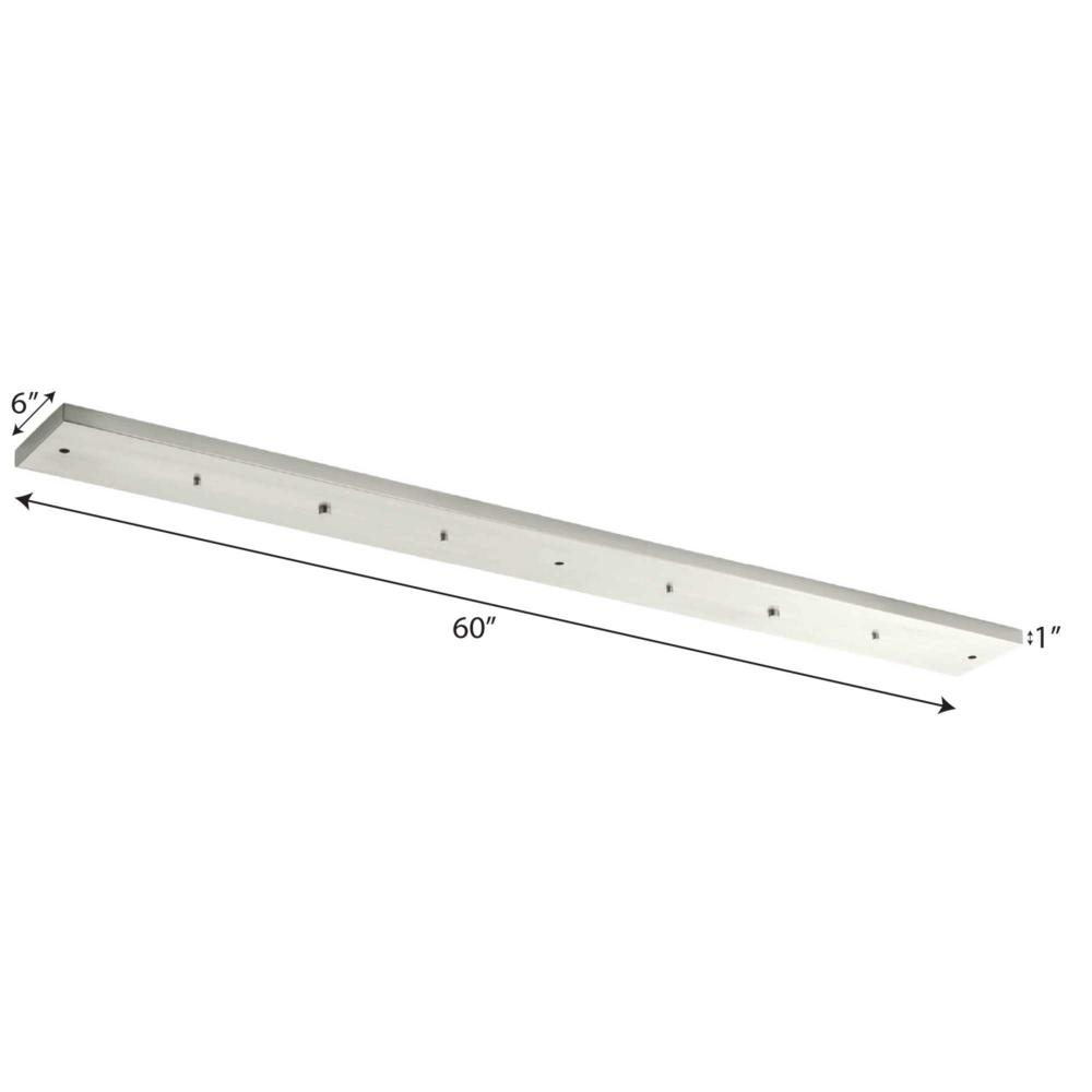 Progress Lighting's canopy accessory offers a convenient way to mount groupings of pendants. This rectangle pendant accessory allows for the hanging of three to five pendants off of one outlet box. Pendants can be hung straight or staggered. The maximum pendant width for three pendants is 18" each and for five pendants 13-1/2" each. Five-Light. Rectangle Canopy Accessory Brushed Nickel finish.