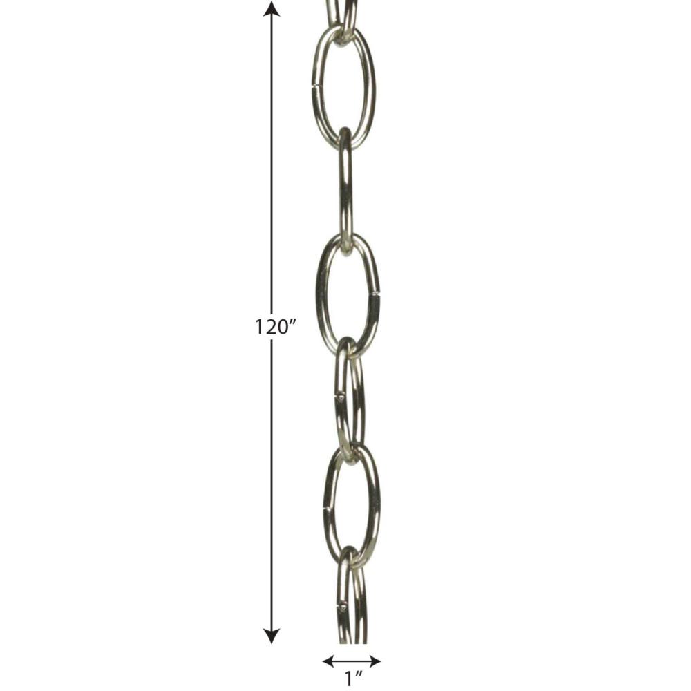 Polished Nickel finish.;Standard 3 o'clock cut, oval chain.;10 Ft. overall length - may be shortened as needed.;9 gauge, 50 lbs. maximum weight.