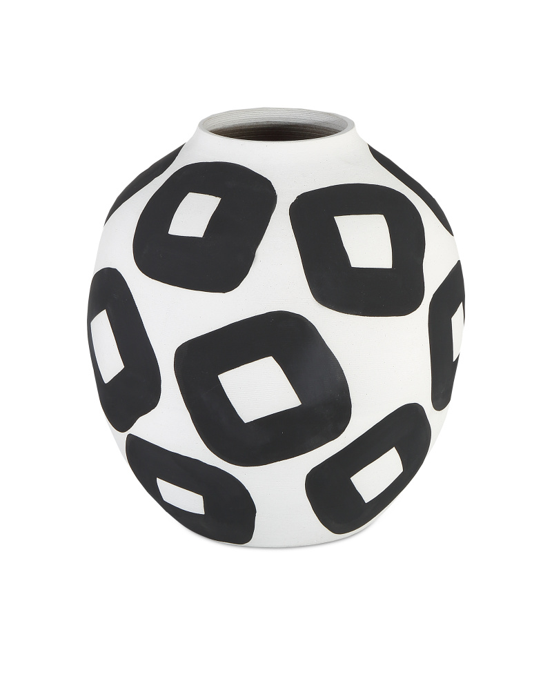 The Pagliacci Small Black & White Vase is made of the finest porcelain in a dynamic matte white finish onto which black contemporized lozenges with negative spaces in the middle are painted. The hollow centers bring extra power to the black and white vase, which makes the decorative accessory perfect for interior styles from contemporary to mid-century modern and transitional. From its place on a shelf or atop a stack of coffee table books on a foyer table, it will be a dynamic artistic piece.