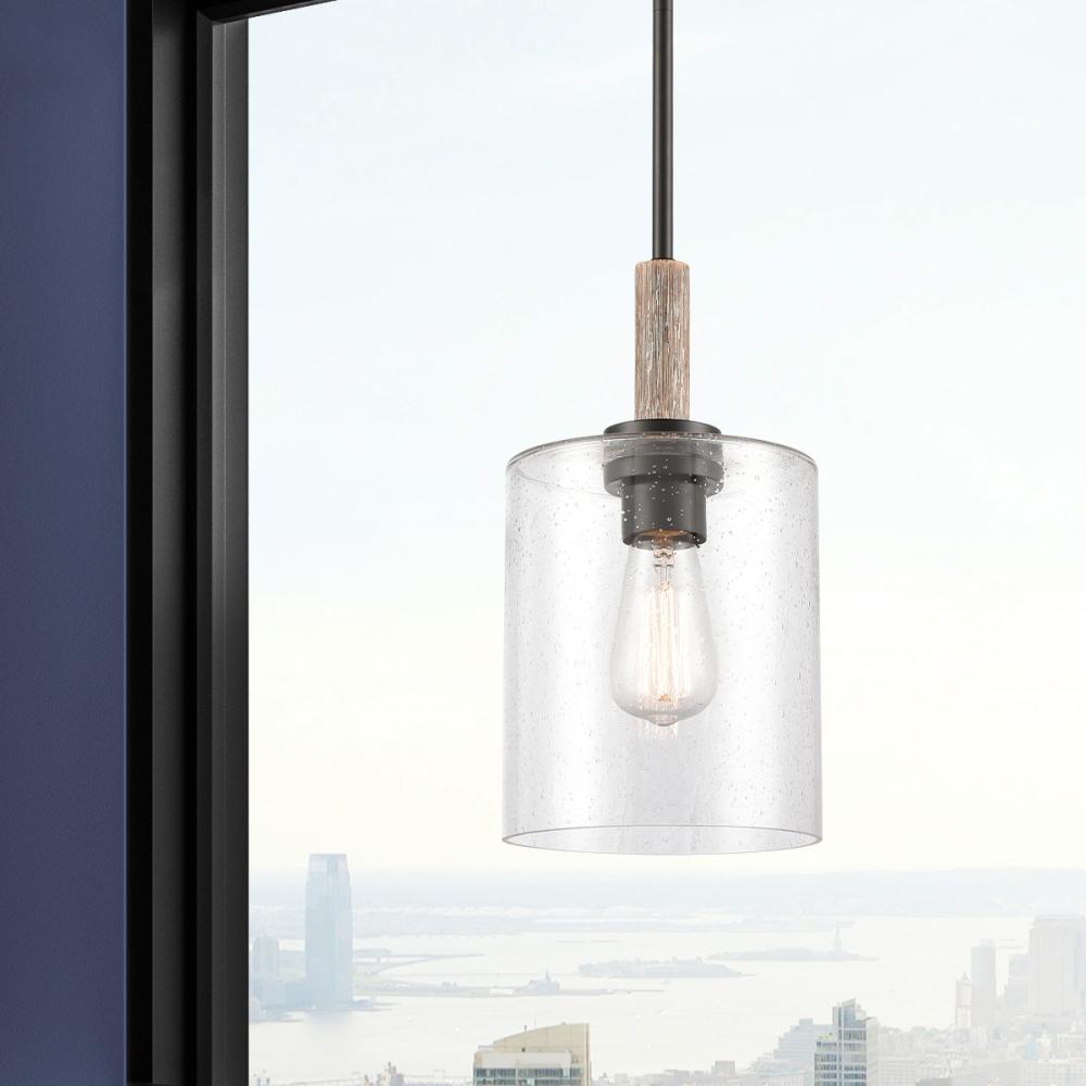 Hand carved cedarwood and birchwood rods are graced with clear seedy glass on this contemporary design.