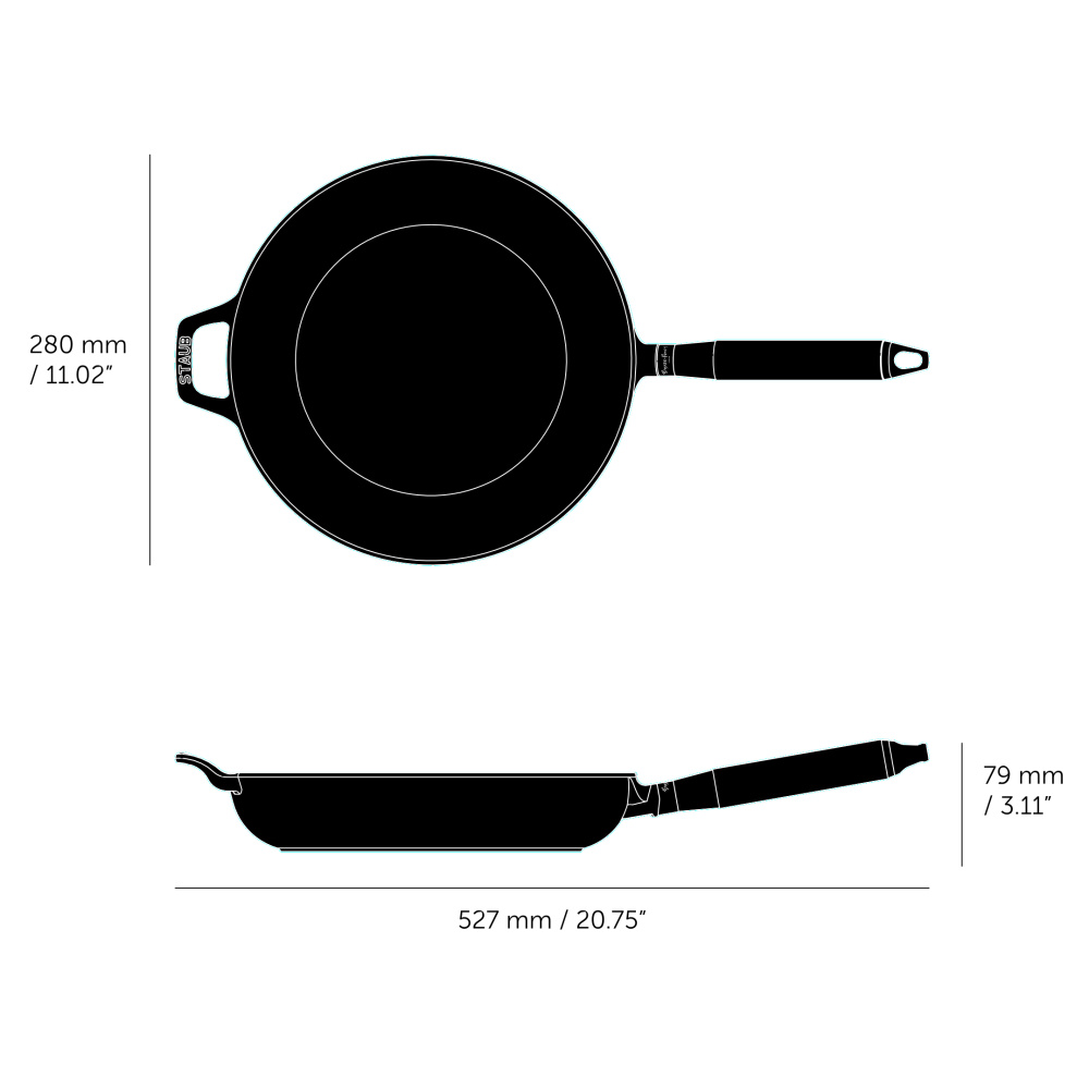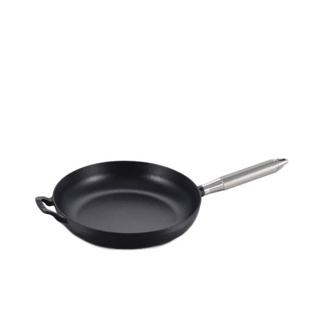 A black cast iron frying pan featuring a signature Buster + Punch handle with diamond-cut cross knurling for enhanced grip and control. Refined by hand and designed to match seamlessly with Buster + Punch kitchen detailing and collections. Available in steel and brass finishes. A Staub collaboration product.