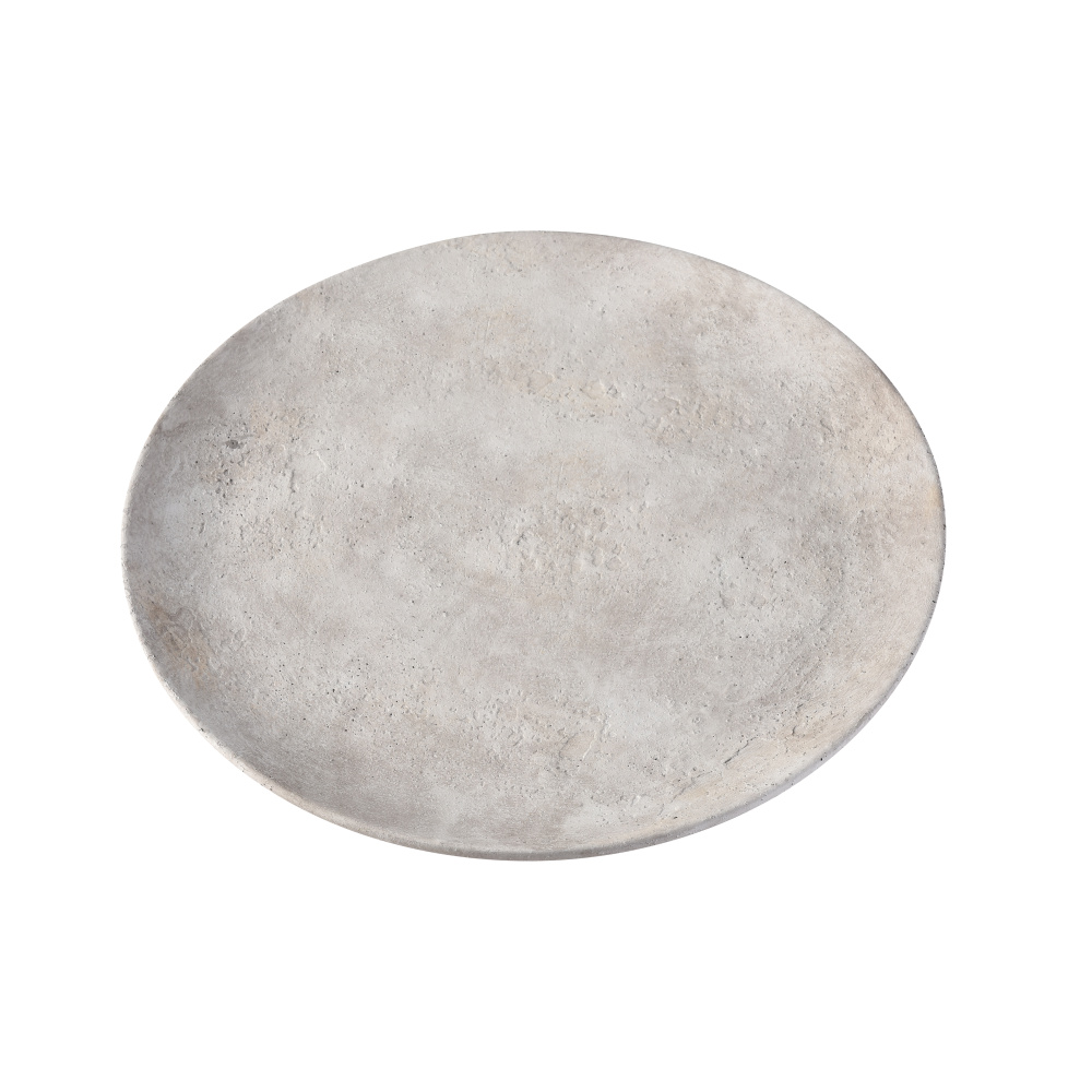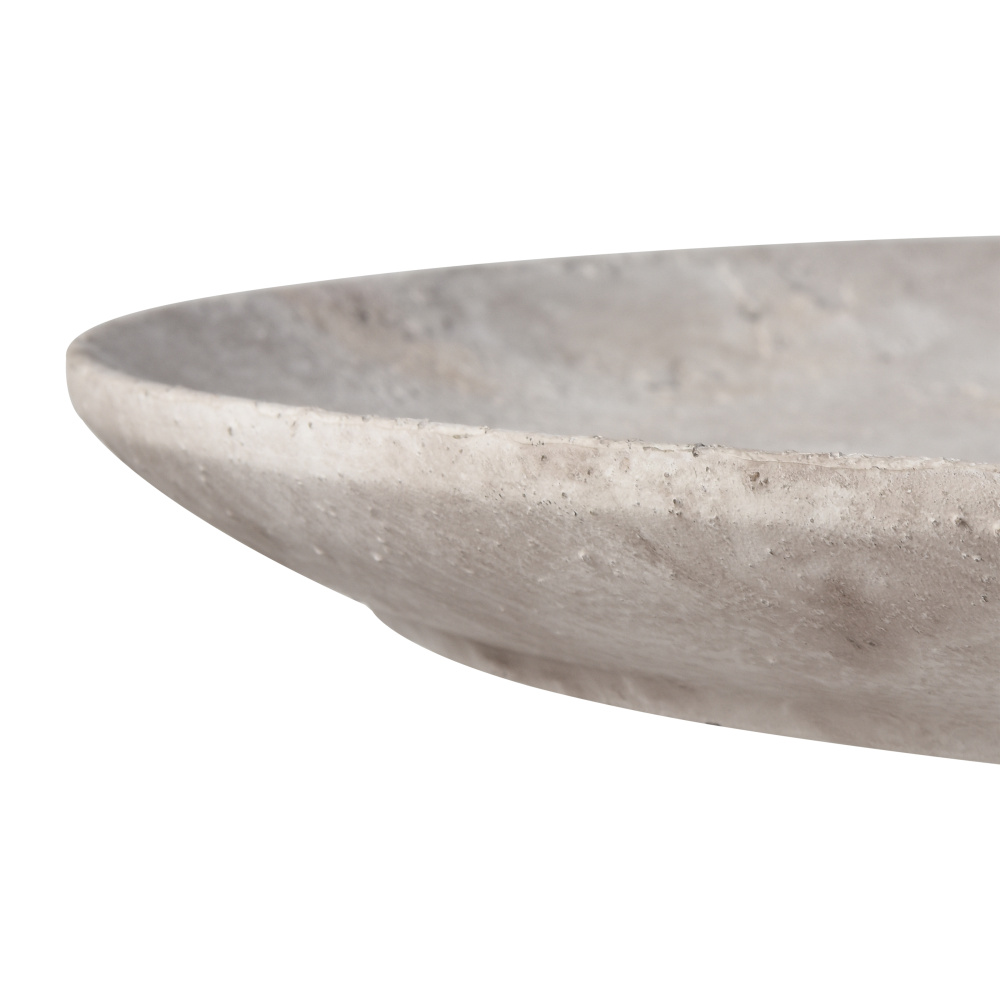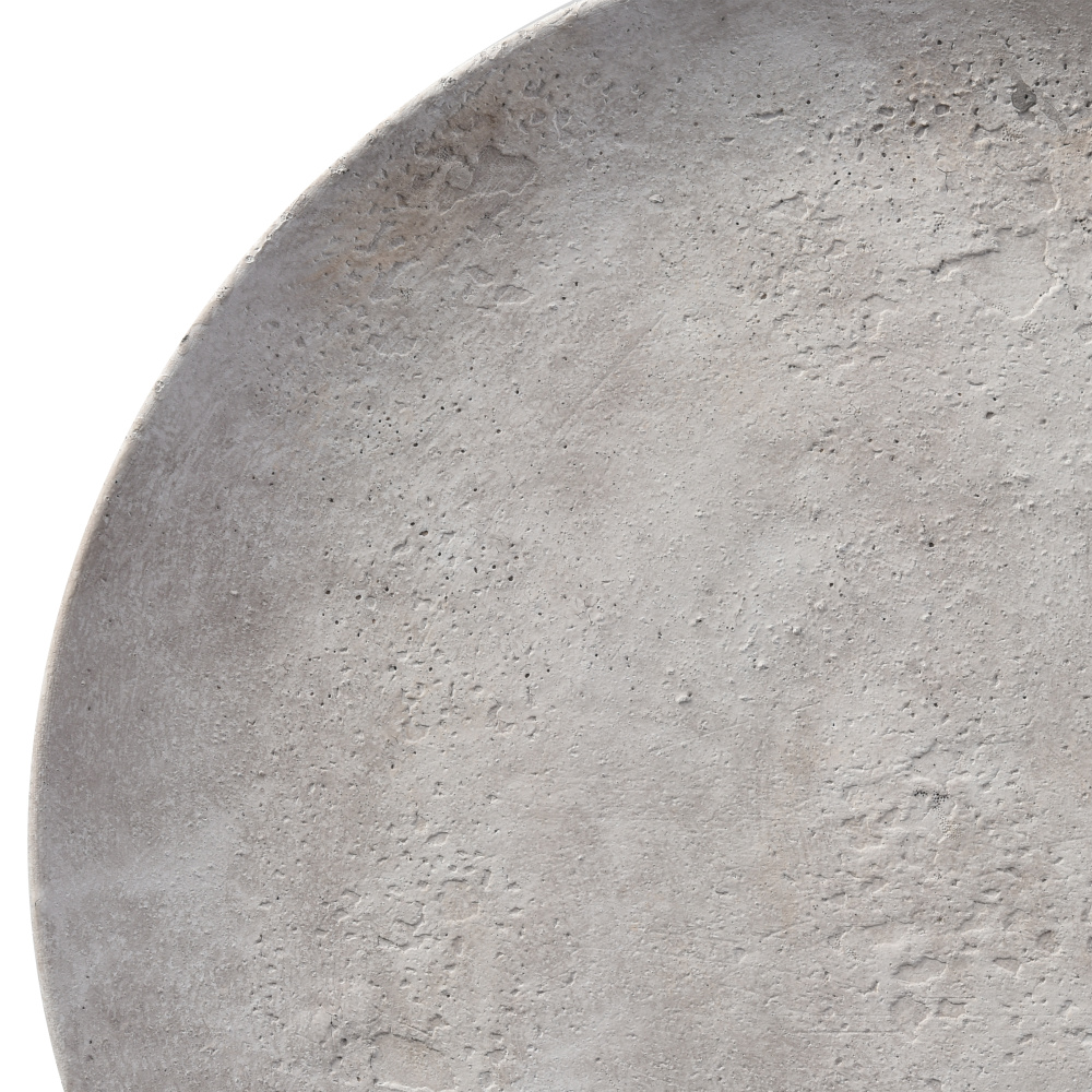 The Pantheon Charger is a large decorative display plate with a matte aged white finish. The slightly irregular textured surface has patina, for a look that feels vintage and collected.
