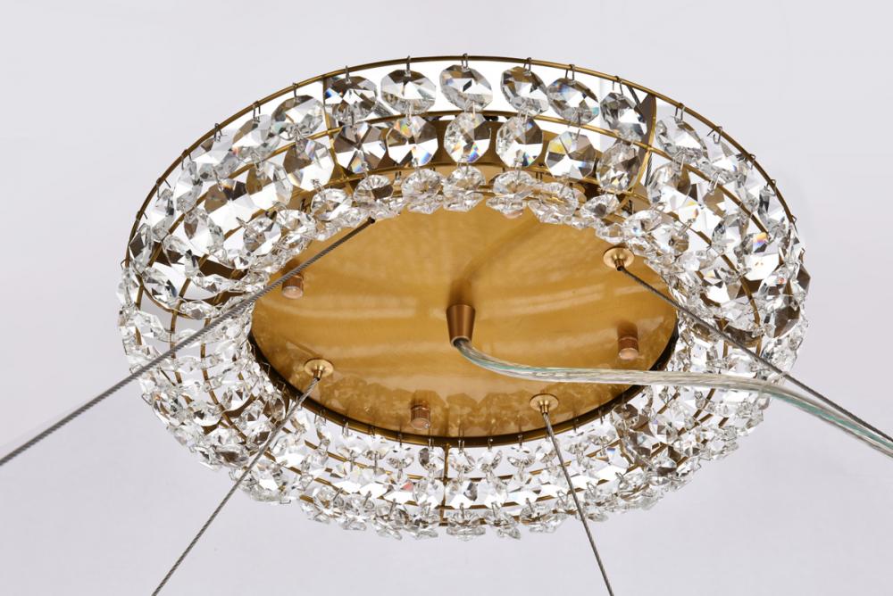 The magnificent chandeliers of the Paris collection live up to their namesake’s title as the "City of Light." The brass finish fixtures exude glamour with a sparkling circle of clear, royal-cut octagon crystals highlighted by 24 interior lights (not included). Topping off the extravagance is a crystal halo dressing the canopy that replicates the fixture. Create your own enlightened era in your home with this contemporary chandelier that comes fully assembled. It will provide all-around light for your dining room, living room, bedroom, bathroom, or entryway.