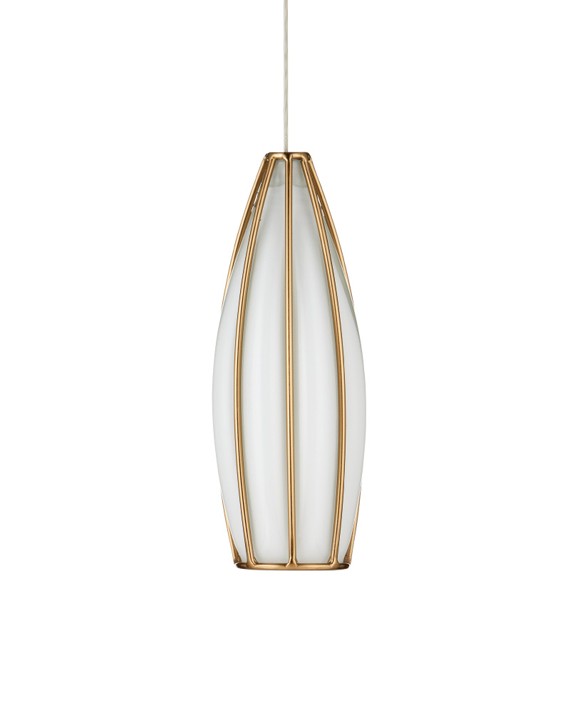The Parish 3-Light Round Multi-Drop Pendant has slender tear-drop-shaped shades made of white glass poured into a metal cage in an antique brass finish when it was still molten. A remarkable result of this process is that it creates tiny pinholes of light that escape through micro-bubbles that formed in the glass, making the Parish effervesce like an upside-down goblet of champagne.