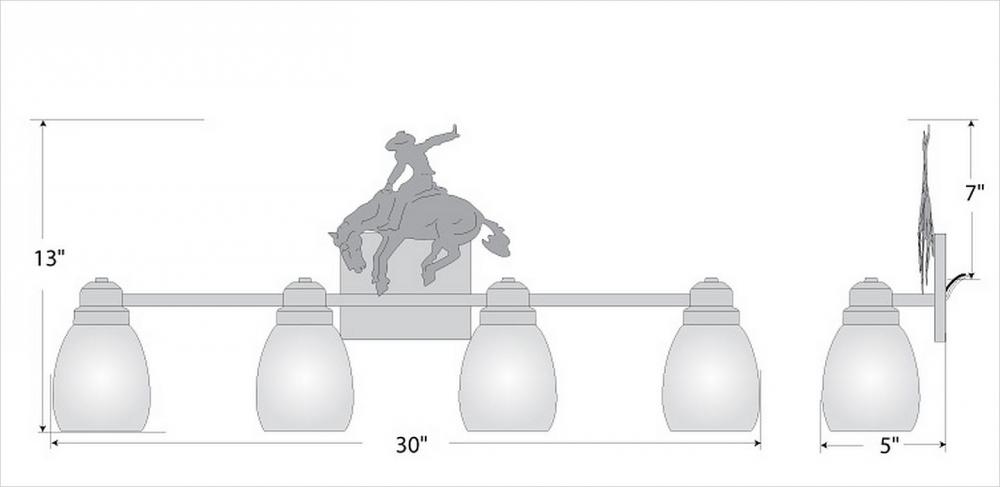Farmhouse style Bath Vanity Lights handmade in USA by Avalanche Ranch Lighting. This light features our exclusive metal wildlife art of a Western. This Bath 4 Light is ideal for anyone looking to add rustic character or unique log home lighting to their home. Dimensions (inches): 13h x 30w and Takes 4 - Type A19 bulbs - 100W max. each