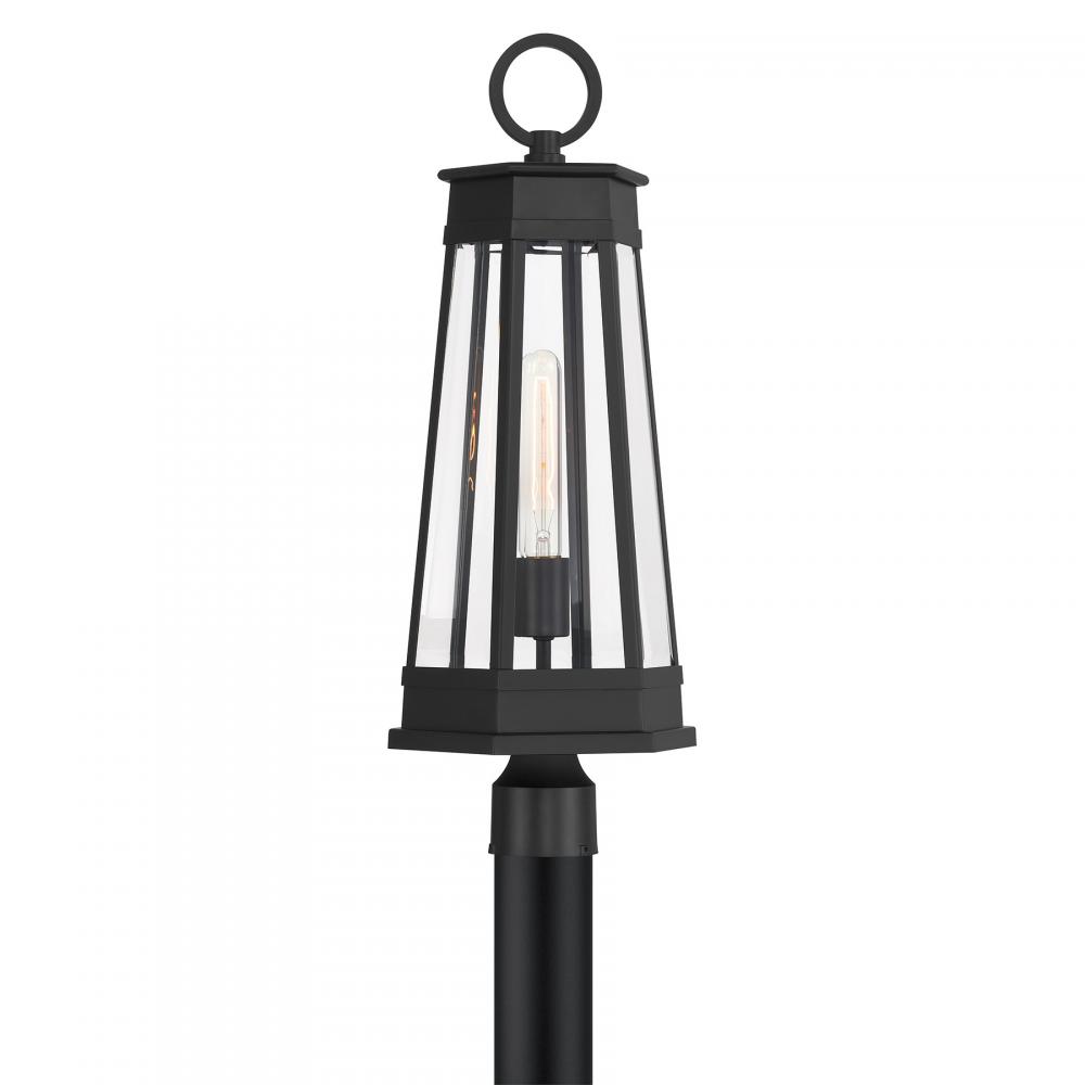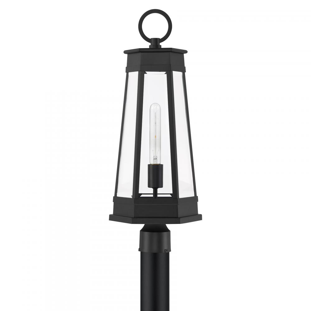Light the way home with the terrific transitional style of the Savoy House Payne 1-light outdoor post light. It has standout style thanks to panes of clear beveled glass, thoughtful geometric detailing and a versatile Matte Black finish. Use it solo or in groupings to create a great first impression. Payne is 24.5" in height and 9.5" in width. Uses one standard size bulb of up to 60 watts. Bulb not included. Payne is wet area rated for use in covered or uncovered outdoor areas.