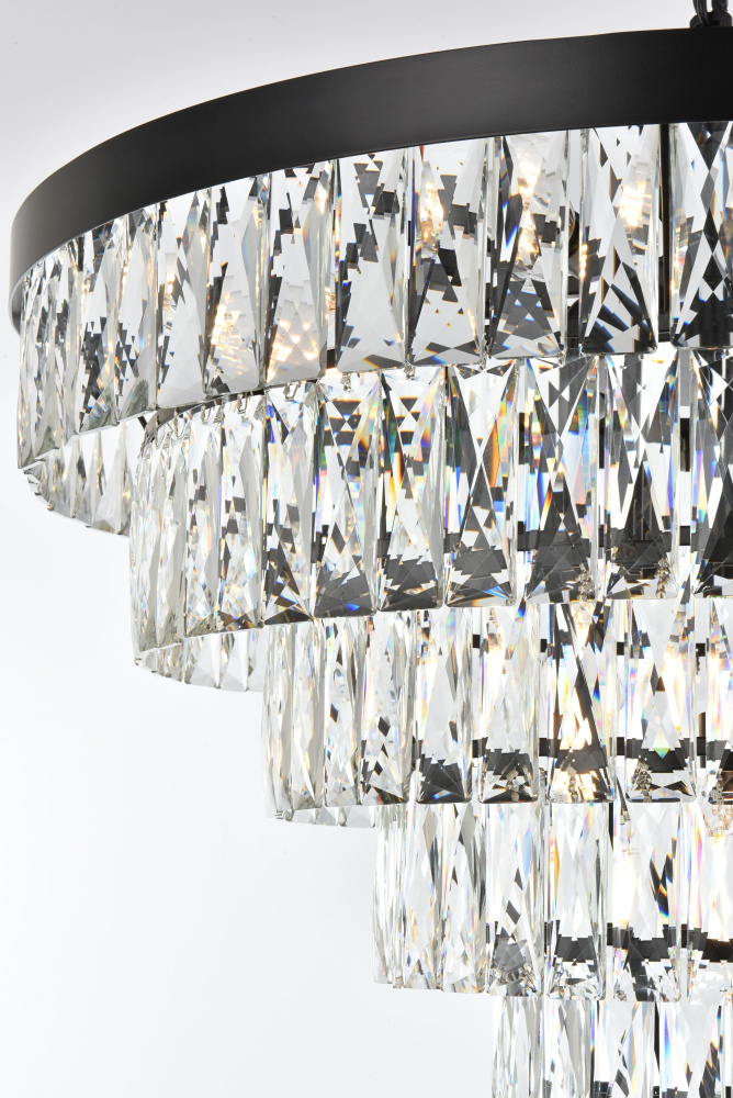 Transform your space with this extraordinary pendant that reimagines classical crystal design for contemporary interiors. The masterfully engineered silhouette features six graduating tiers that create a spectacular inverted pyramid, reminiscent of a frozen cascade captured in mid-descent. Each precisely cut rectangular crystal is strategically positioned to maximize light play, creating mesmerizing displays of fractured light throughout your space. The substantial scale makes this fixture an ideal centerpiece for grand entryways, sophisticated dining rooms, or executive offices. The thoughtful construction incorporates 13 light sources distributed throughout the tiers, ensuring both spectacular illumination and enchanting crystal animation. The robust iron framework provides a secure foundation while maintaining visual lightness, allowing the crystals to appear as if floating in space. Available in reflective chrome, sophisticated black, or warm satin gold, this pendant makes an unforgettable statement while maintaining refined restraint. The cascading arrangement creates a sense of movement and flow, while the geometric precision of each crystal adds contemporary edge to the classical form. This is more than a light fixture – it's an architectural feature that transforms your space through its commanding presence and spectacular light performanc