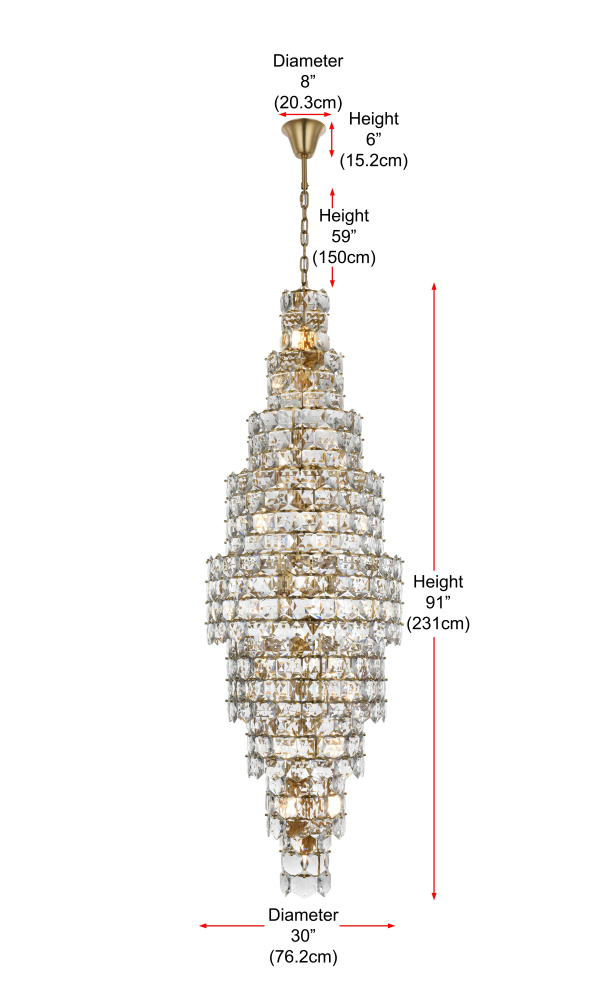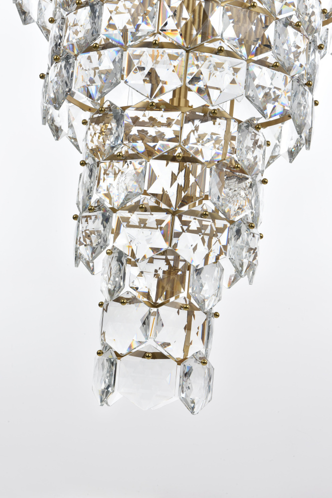 Transform your space with this spectacular crystal pendant that redefines modern luxury. The masterfully engineered design features ten graduating tiers that create a dramatic tapered silhouette, reminiscent of a frozen waterfall captured in mid-descent. Each precisely cut hexagonal crystal is strategically positioned to maximize light play, creating mesmerizing displays of fractured light and shadow throughout your space. The substantial scale and architectural presence make this fixture an ideal centerpiece for grand entryways, sophisticated dining rooms, or executive offices. The thoughtful construction incorporates 41 light sources distributed throughout the tiers, ensuring both spectacular illumination and enchanting crystal animation. The robust iron framework provides a secure foundation while maintaining visual lightness, allowing the crystals to appear as if floating in space. Whether styled in reflective chrome or warm satin gold, this pendant makes an unforgettable statement while maintaining sophisticated restraint. The cascading arrangement creates a sense of movement and flow, while the geometric precision of each crystal adds contemporary edge to the classical form. This is more than a light fixture – it's an architectural feature that transforms your space through its commanding presence and spectacular light performanc