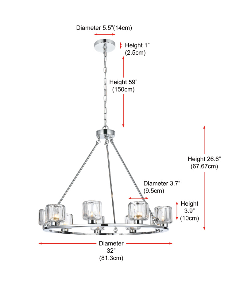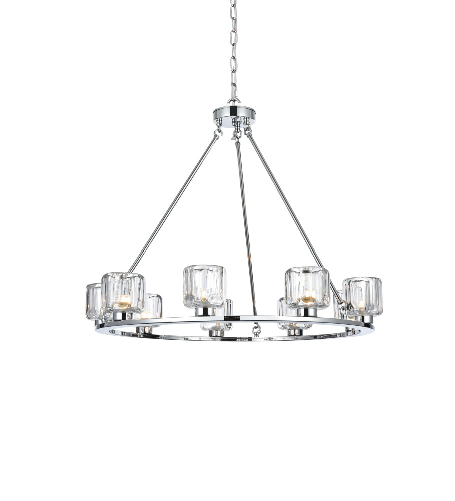 Add modern charm to your space with this striking chandelier, where a sleek circular iron frame meets sculpted clear glass shades. The unique design features decorative hanging rods with hooks, enhancing the structure with industrial flair. The clear glass refracts light beautifully, creating a radiant glow that uplights your space with warmth and dimension. Perfect for dining rooms, living rooms, or offices, this chandelier is available in black for a bold contrast, satin gold for a luxurious touch, and chrome for a sleek, modern vibe. With multiple size options and a matching canopy and chain for seamless installation, this dimmable chandelier offers both beauty and versatility. Light bulbs are not included, allowing you to choose the perfect style to match your vision.