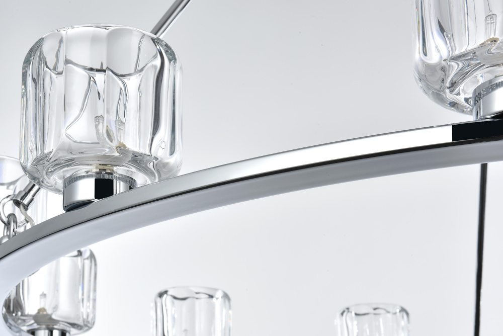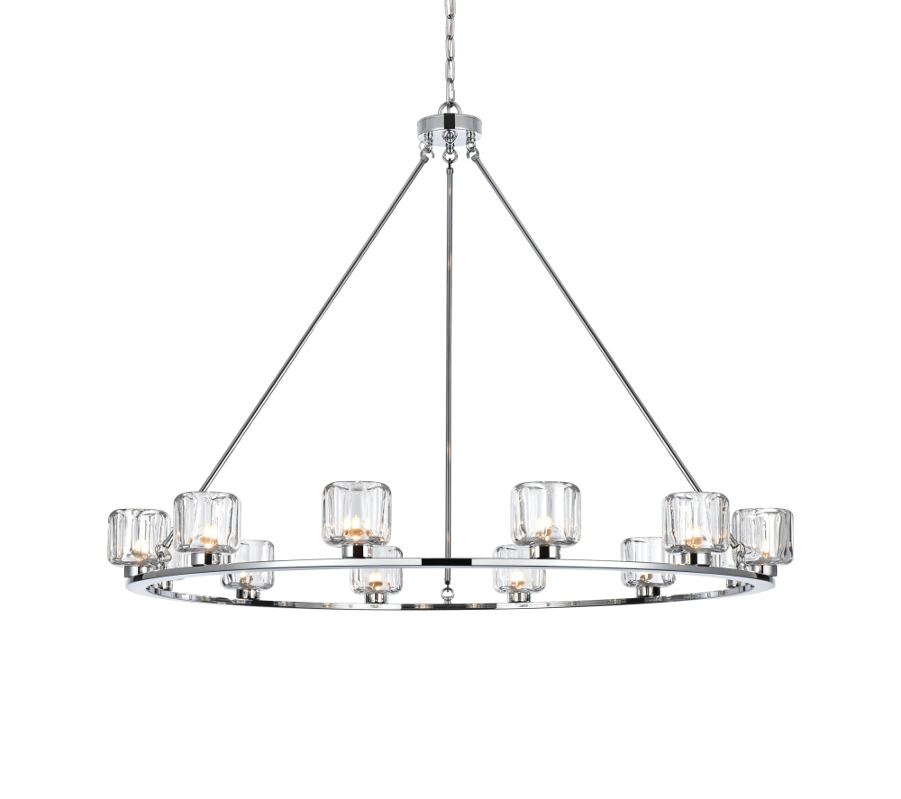 Add modern charm to your space with this striking chandelier, where a sleek circular iron frame meets sculpted clear glass shades. The unique design features decorative hanging rods with hooks, enhancing the structure with industrial flair. The clear glass refracts light beautifully, creating a radiant glow that uplights your space with warmth and dimension. Perfect for dining rooms, living rooms, or offices, this chandelier is available in black for a bold contrast, satin gold for a luxurious touch, and chrome for a sleek, modern vibe. With multiple size options and a matching canopy and chain for seamless installation, this dimmable chandelier offers both beauty and versatility. Light bulbs are not included, allowing you to choose the perfect style to match your vision.