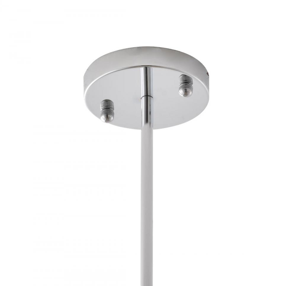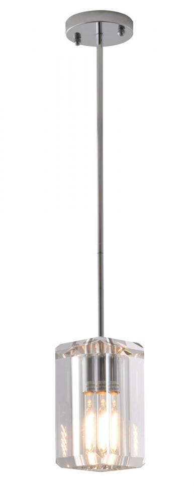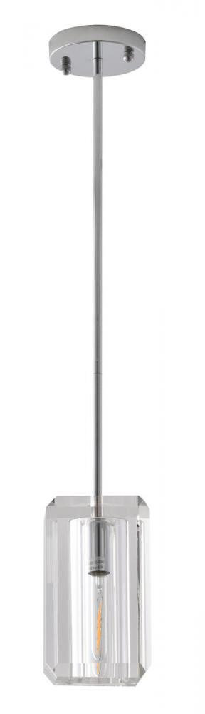 This exquisite pendant is in a chrome finish. The frame is made out of metal, and it comes with a clear crystal shade. The adjustable cord link makes this fixture suitable for most ceiling heights.