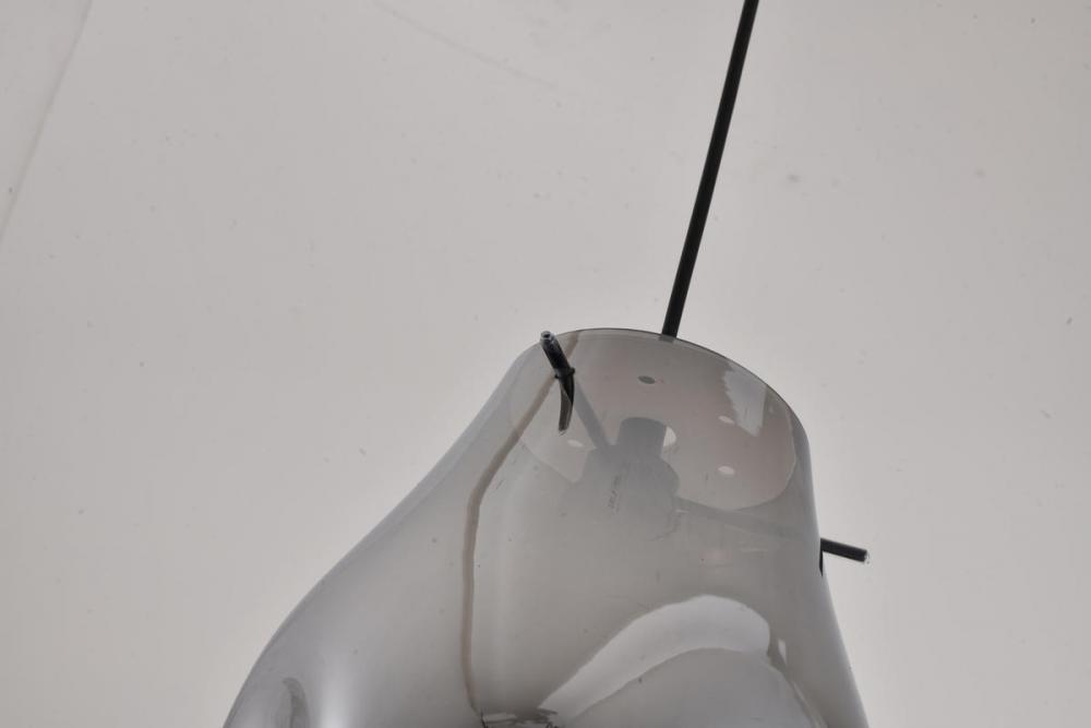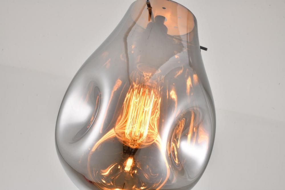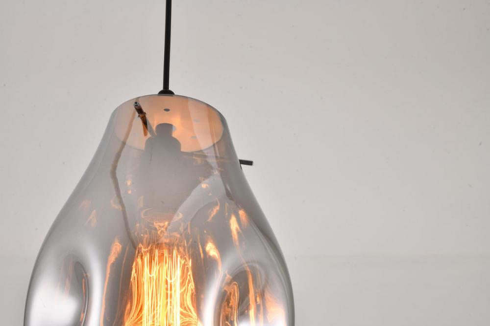 This exquisite pendant is has a black metal frame. It comes a dented smoke jar glass shade. The adjustable cord link makes this fixture suitable for most ceiling heights.