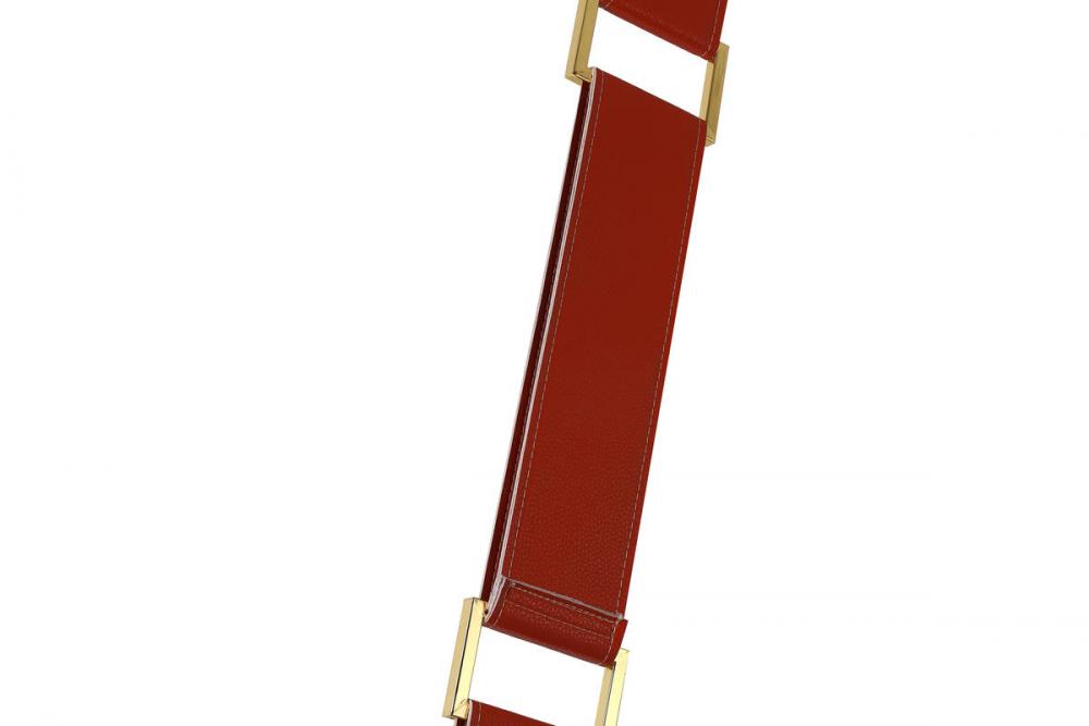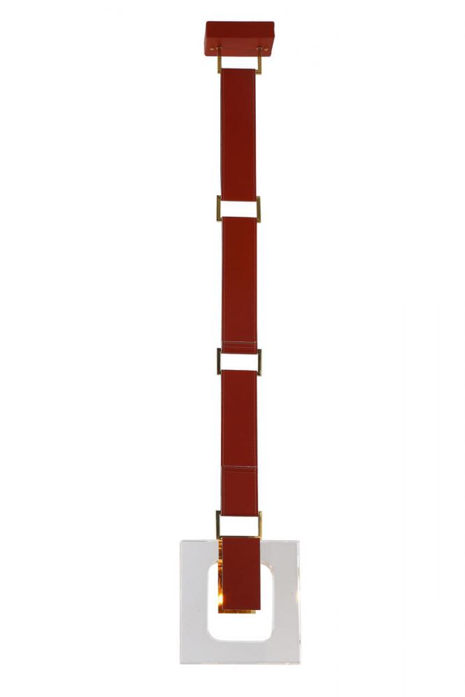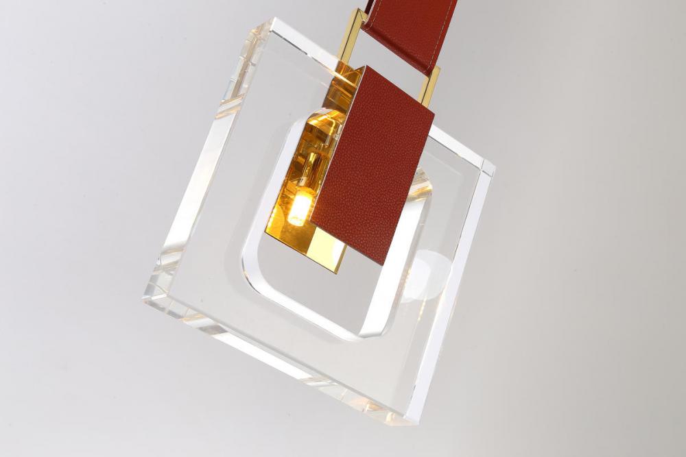 This unique pendant has a gold metal frame. It comes with a clear crystal block, and it also has a red leather strap for hanging this fixture. You can create a timeless feel while using modern forms.