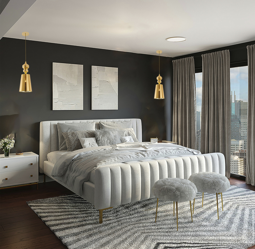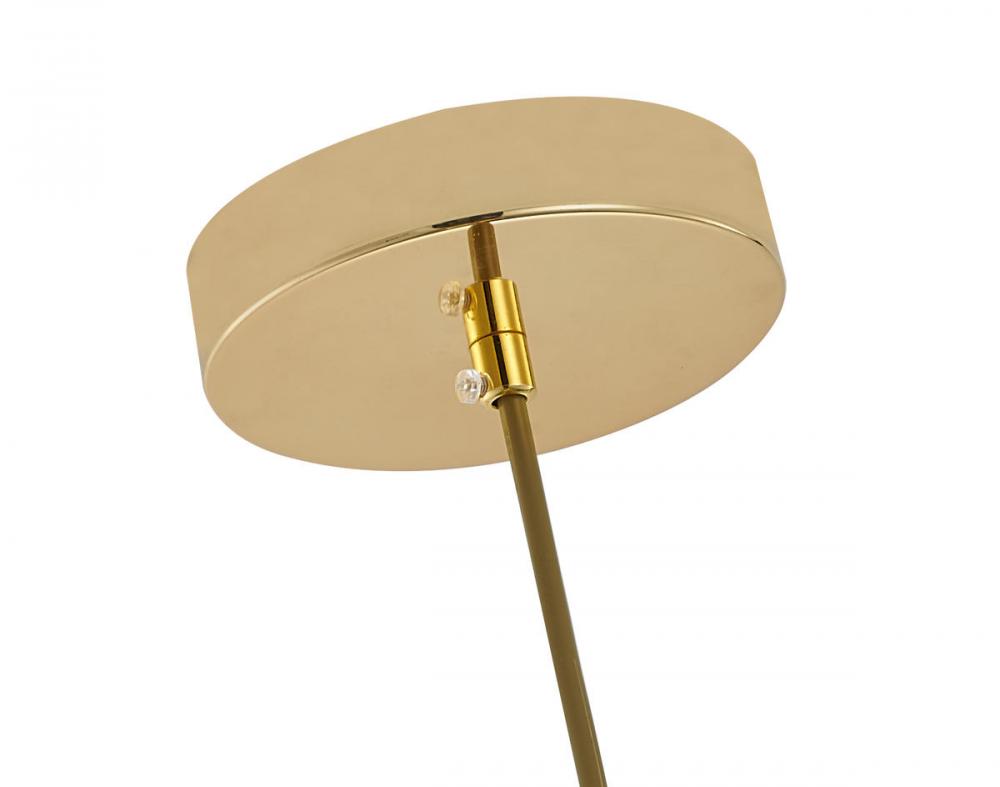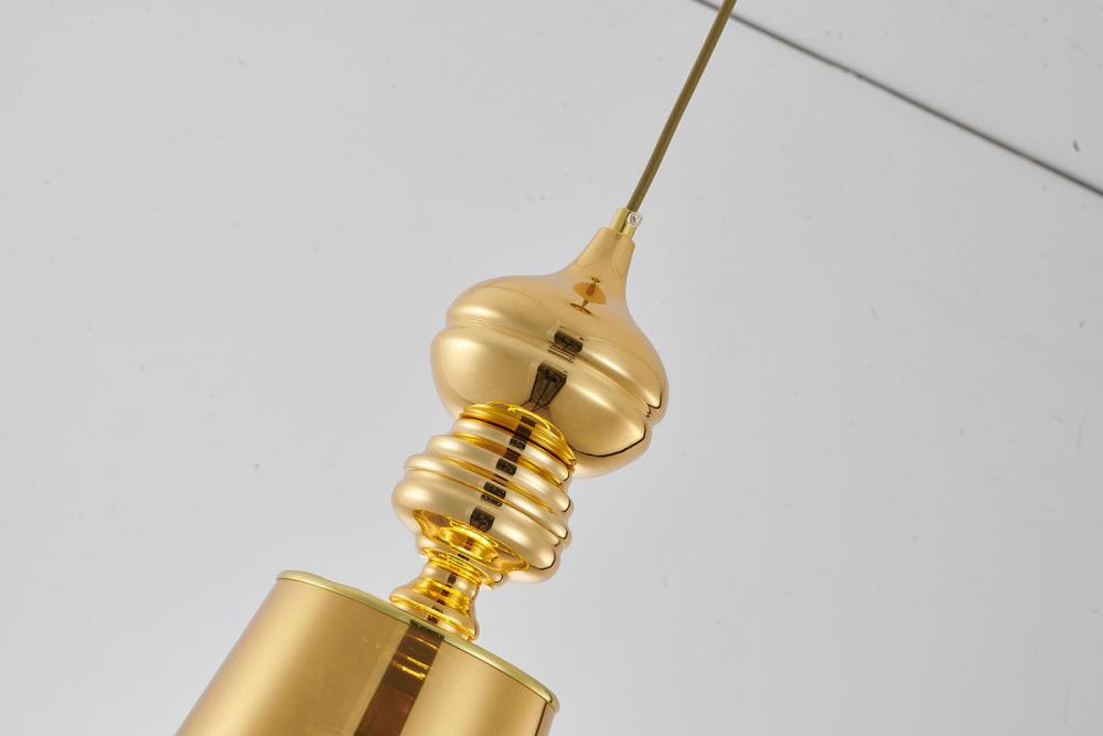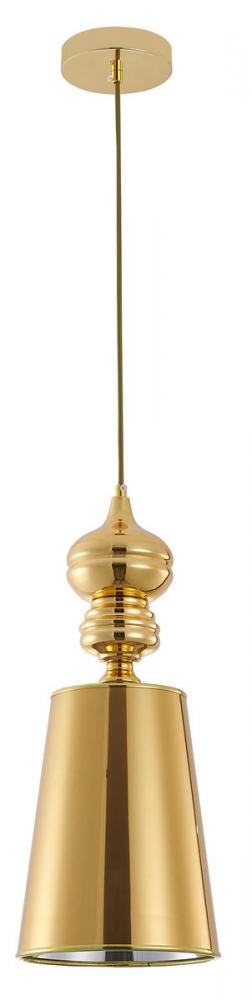 This single pendant light is in a polished gold finish. The frame is made out of metal, and it comes with polished gold shade. The adjustable cord link makes this fixture suitable for most ceiling heights